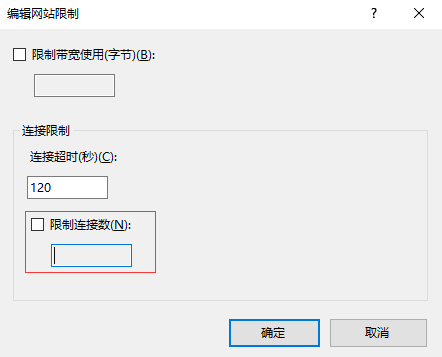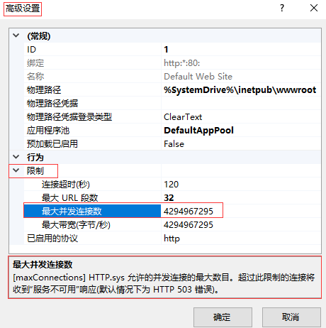 “管理網(wǎng)站” → “高級設(shè)置...” → “限制” → “最大并發(fā)連接數(shù)”
