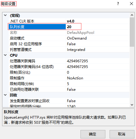 “應(yīng)用程序池” → 找到網(wǎng)站的所屬應(yīng)用程序池 → 右鍵“高級設(shè)置...” → “常規(guī)” → “列隊長度”,設(shè)置為20
