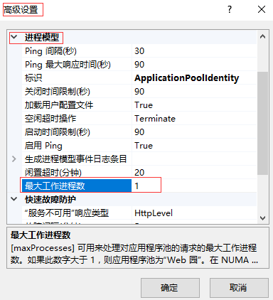 “應(yīng)用程序池” → 找到網(wǎng)站的所屬應(yīng)用程序池 → 右鍵“高級設(shè)置...” → “進(jìn)程模型” → “最大工作進(jìn)程數(shù)”,默認(rèn)值為1。