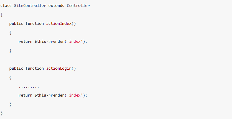 在yii中,所有的邏輯代碼都寫在控制器中,而每一個操作又叫動作,所以在yii中,一個控制器的大概結(jié)構(gòu)就是: