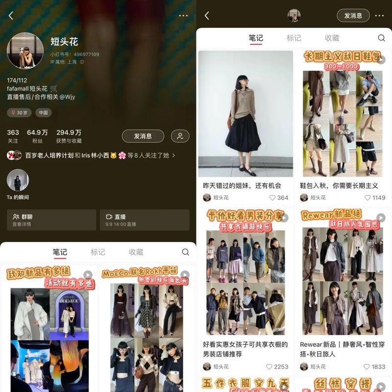 在此之后,她幾乎保持著日更的頻率分享穿搭內(nèi)容,有簡潔實(shí)用的“一衣多穿”,也有營造氛圍感的“多層疊穿”等,越來越多網(wǎng)友被她的穿搭品味吸引并購入“短頭花同款”,也讓她積累了64.9萬小紅書粉絲。