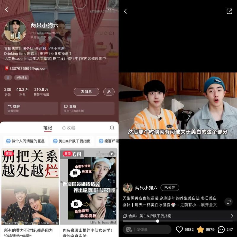 小紅書賬號“兩只小狗六”由健太郎和元?dú)馔鑳扇诉\(yùn)營,他們相識(shí)于大學(xué),曾以練習(xí)生的身份闖蕩過娛樂圈。雖然奮斗多年沒能成名,但兩人憑借藝人經(jīng)歷對于護(hù)膚美妝有著天然的親近感,走上了電商道路。最初,“兩只小狗六”選擇在另一內(nèi)容平臺(tái)24小時(shí)輪番直播的形式,但高壓無休的工作節(jié)奏讓兩人覺得內(nèi)卷到失去了生活。