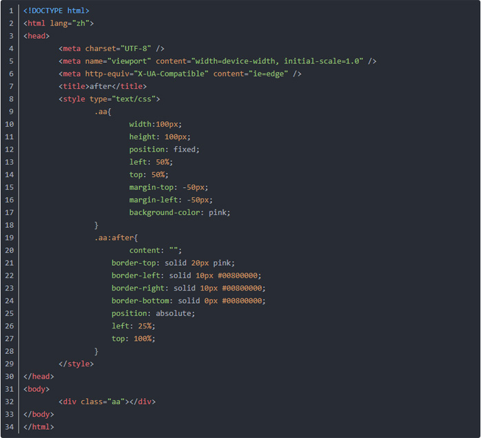 先是一個隨意的DIV,可以根據(jù)自己的需要加在自己想樣用到的地方,然后通過他的偽類:after添加content,三角形的形狀是通過它的四個方向的邊框去實現(xiàn)的,其中三個方向的邊框設(shè)置顏色為透明。
