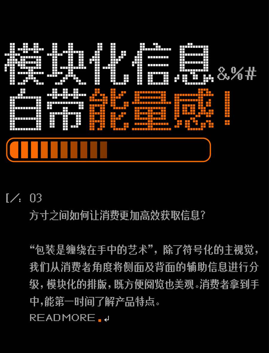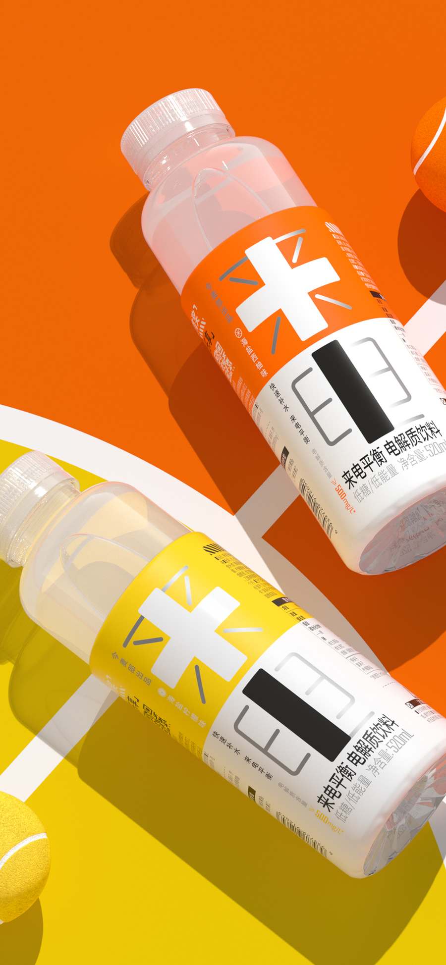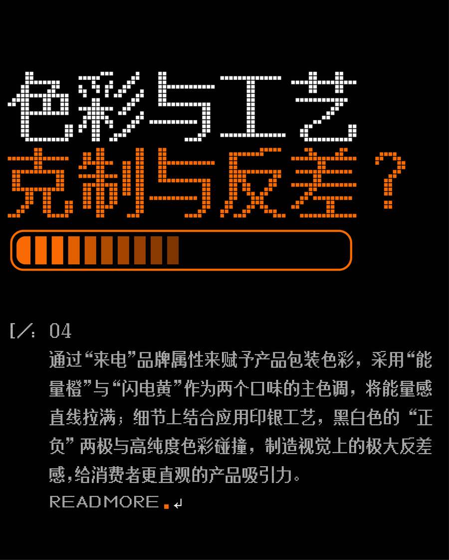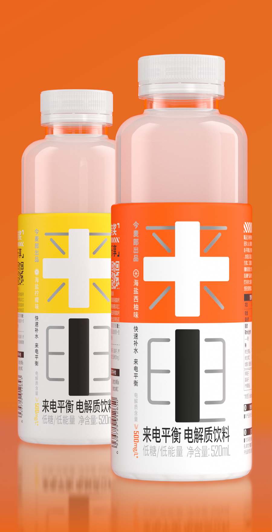 主視覺上將產(chǎn)品名與正負(fù)極符號(hào)相結(jié)合設(shè)計(jì),最大化的凸顯視覺符號(hào)。符號(hào)的意義在于降低品牌的成本——被發(fā)現(xiàn)的成本和被記住的成本。巧思之下,再將瓶身的輔助信息進(jìn)行分級(jí),模塊化板式設(shè)計(jì),既方便消費(fèi)者高效獲取產(chǎn)品信息同時(shí)簡(jiǎn)潔大方;采用“能量橙”與“閃電黃”作為兩款口味的主色調(diào),黑白色的“正負(fù)極”符號(hào)與高純度色彩相碰撞,視覺上的極大反差將能量感直線拉滿,給消費(fèi)者帶來更直觀的產(chǎn)品吸引力。