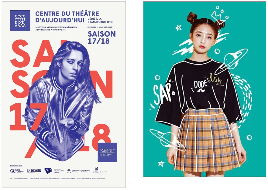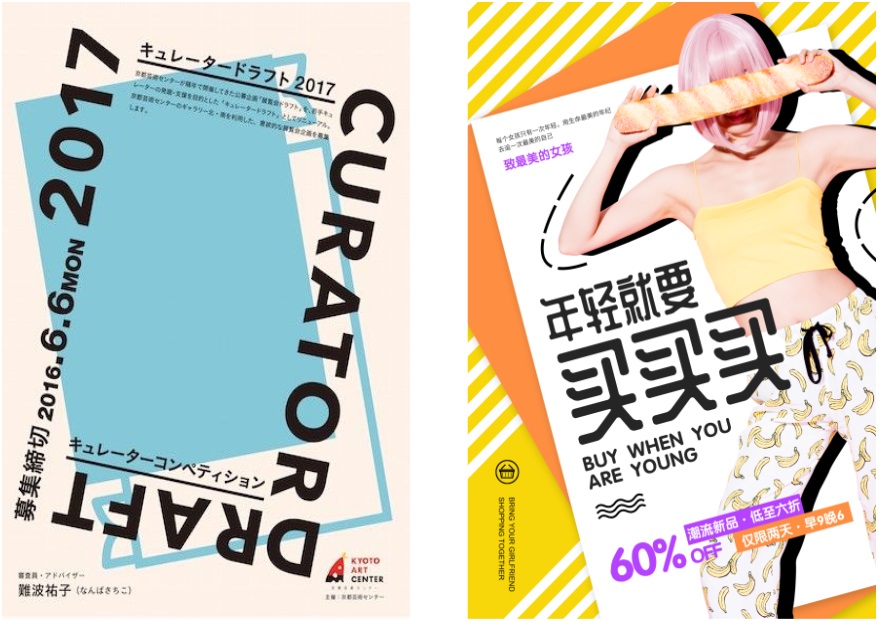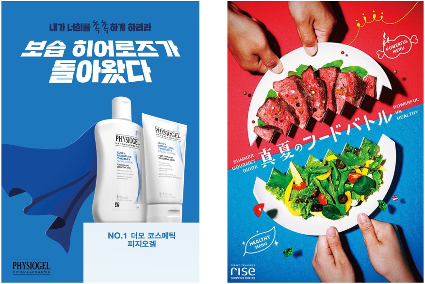 第二個(gè)問(wèn)題,產(chǎn)品不突出。一般來(lái)說(shuō)我們要先針對(duì)自己的版式進(jìn)行自查,首先排除因?yàn)榇笮≡斐傻牟煌怀觯诙皆倥挪槭遣皇且驗(yàn)樵仉s亂。如果都有基礎(chǔ)問(wèn)題,我們就可以去尋找一些技巧了。左邊這個(gè)圖用到的是漸變映射+文字前后穿插。右邊這個(gè)圖用到的是實(shí)物結(jié)合手繪,同時(shí)元素高度集中在核心視覺(jué)附近,這樣問(wèn)題不是又解決了