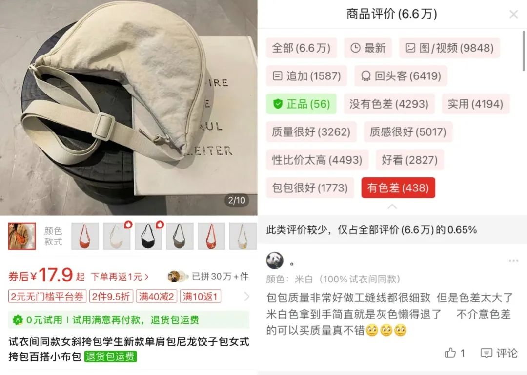 比如某拼多多中有一款銷量超過30萬的“優(yōu)衣庫平替版餃子包”,商品名稱中包含“同款”二字,但查看商品評價,有一部分消費者提出有色差問題,“米白色拿到手簡直是灰色”。