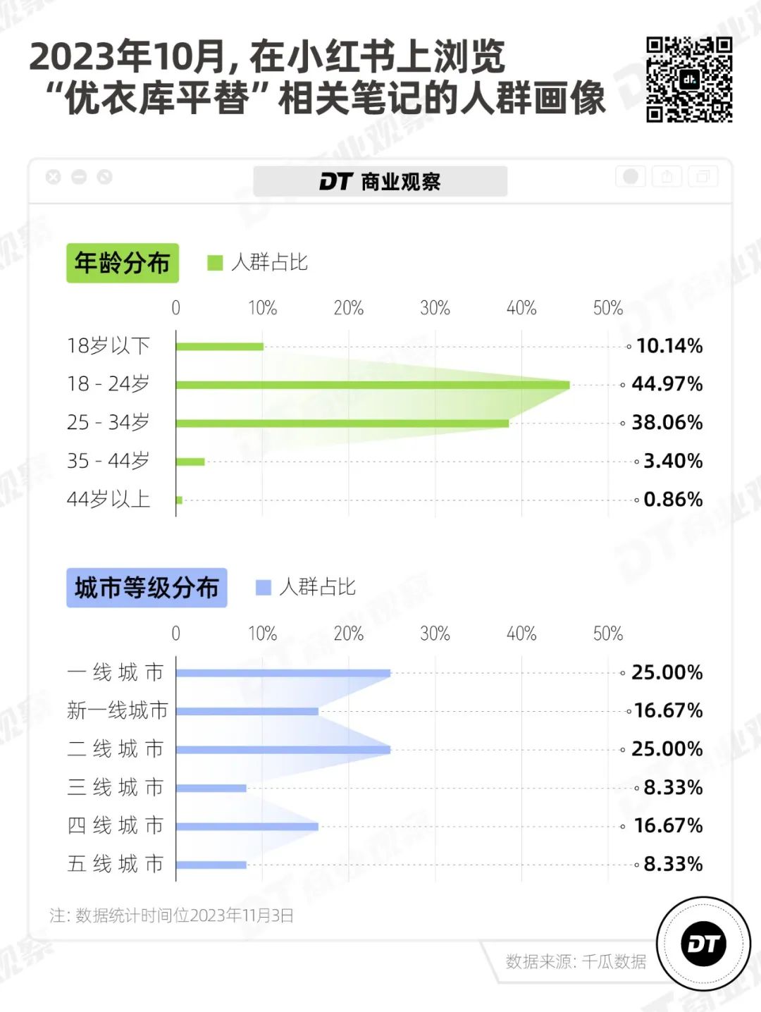 從千瓜數據來看,在小紅書上瀏覽“優(yōu)衣庫平替”的人群中,18-24歲、25-34歲的人群占比最高,其次是18歲以下的人群。