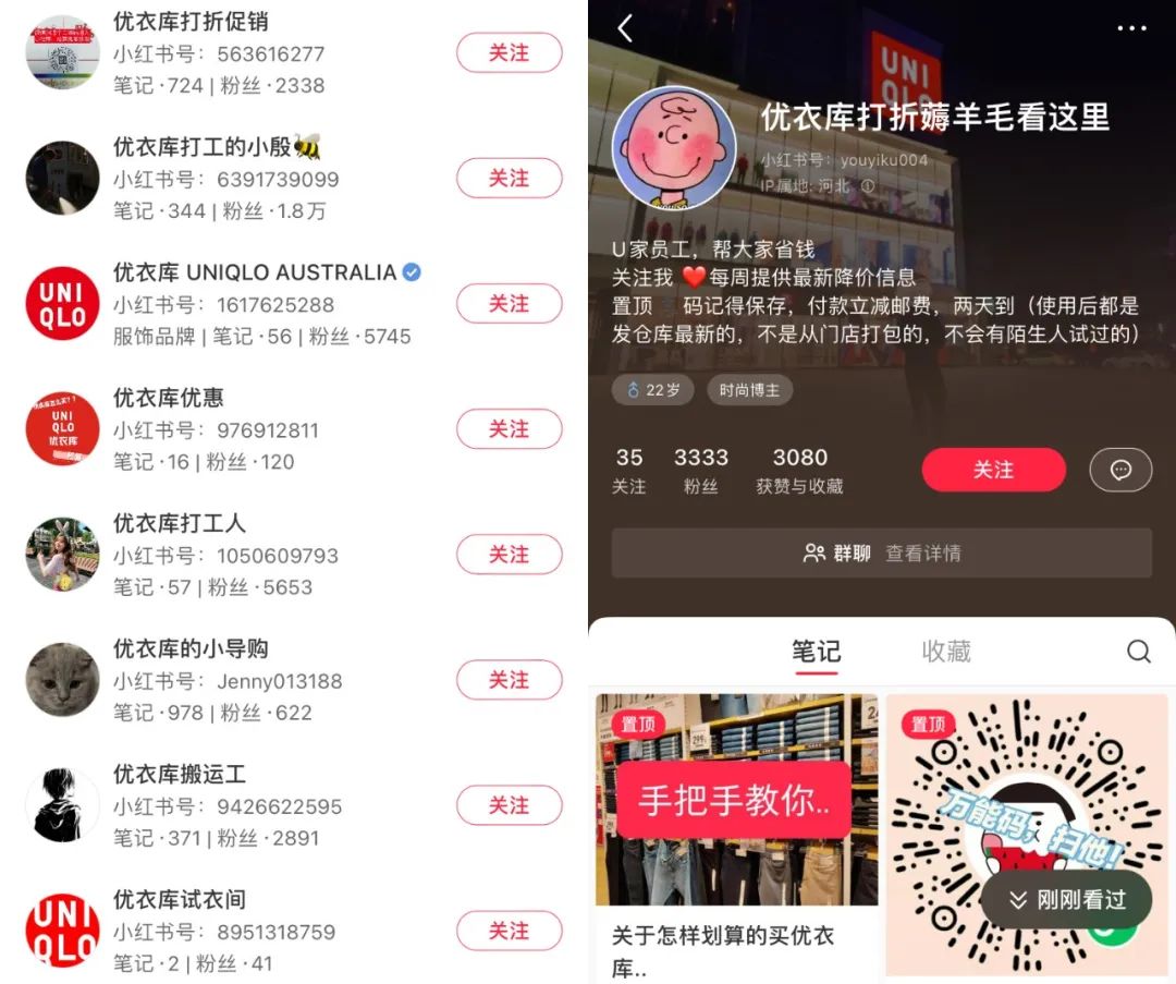但如果打開小紅書搜索“優(yōu)衣庫”或“U家”等相關關鍵詞,選擇“用戶”,你會看到很多分享優(yōu)衣庫降價、打折信息相關的賬號。