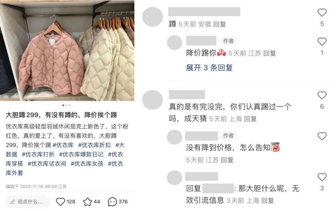 《DT商業(yè)觀察》在瀏覽小紅書評論區(qū)時發(fā)現,優(yōu)衣庫員工總是讓人在筆記中“蹲降價”,等降價后再回頭“踢”(提醒)用戶可以下單。