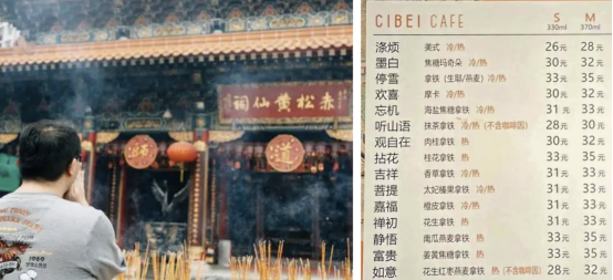比如在當下寺廟參觀的火爆現(xiàn)象外,各色“寺廟+”的“慈悲經(jīng)濟”也緊隨其后。首先在咖啡種類的取名上巧妙構(gòu)思,采用寺廟特有名詞傳遞出寺廟禪意及祝福理念。如吉祥、嘉福、靜悟及富貴等,又將杯套上的拉環(huán)做成“上上簽”的概念,消費者打開就能收到“日進斗金”、“一夜暴富”等祝福語,方方面面都照顧了用戶的訴求,將情緒價值貫穿始終。