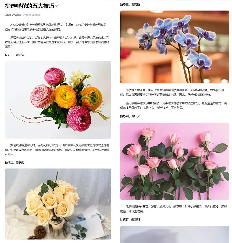 2、我們還可以想想買花的人會關(guān)心什么問題。比如怎么選花?怎么讓花能更持久地保鮮?所以我們可以寫一篇圖文、錄制一段視頻,或者做一本手冊專門教大家怎么選擇新鮮的花、好看的花、有意義的花,怎么延長花期等等。