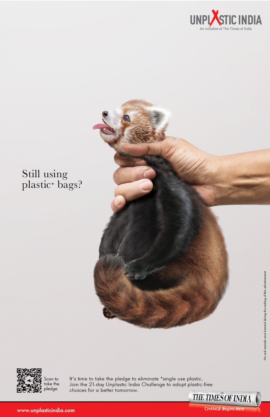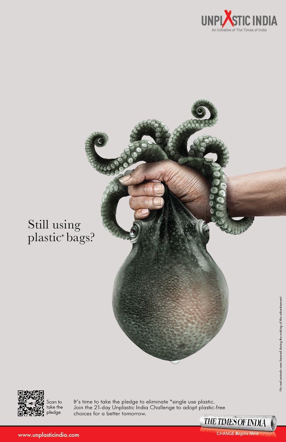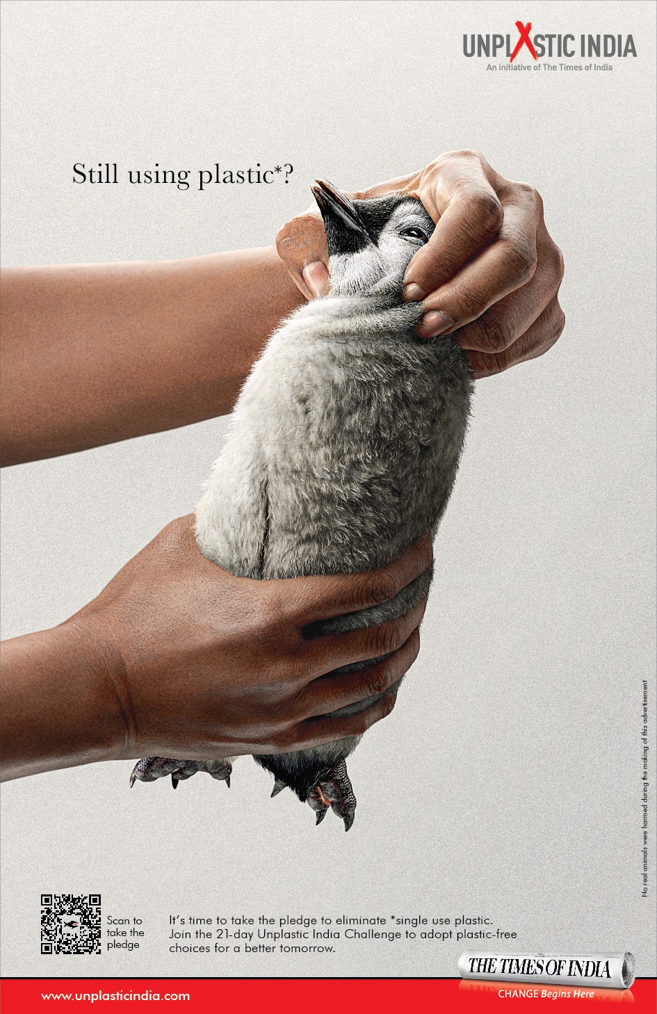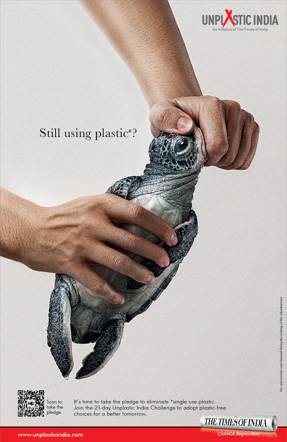 世界環(huán)境日當天,《印度時報》刊登了一組以#UnPlasticIndia(印度無塑料)為主題的海報。海報畫面用人類扼住動物脖子的動作,模擬了人類用手擰開塑料的樣子,以此來表明人類是如何無情地殺害海洋生物的。動物們掙扎窒息的狀態(tài)觸目驚心,這些海洋生物們看著你的眼睛,問了一個簡單的問題:Still using plastic?(還在使用塑料嗎?)