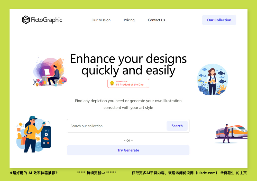PictoGraphic 是一個 AI 插圖資源庫,目前收錄了超過 40000 張 AI 插畫圖像和 SVG 文件,包含黑白線條、扁平極簡、3D 等距、鋼筆手繪等多種風(fēng)格,同時支持用戶自己通過文本生成。PNG 格式的插畫文件可以每月免費下載 10 張,僅供個人使用并需要注明來源。