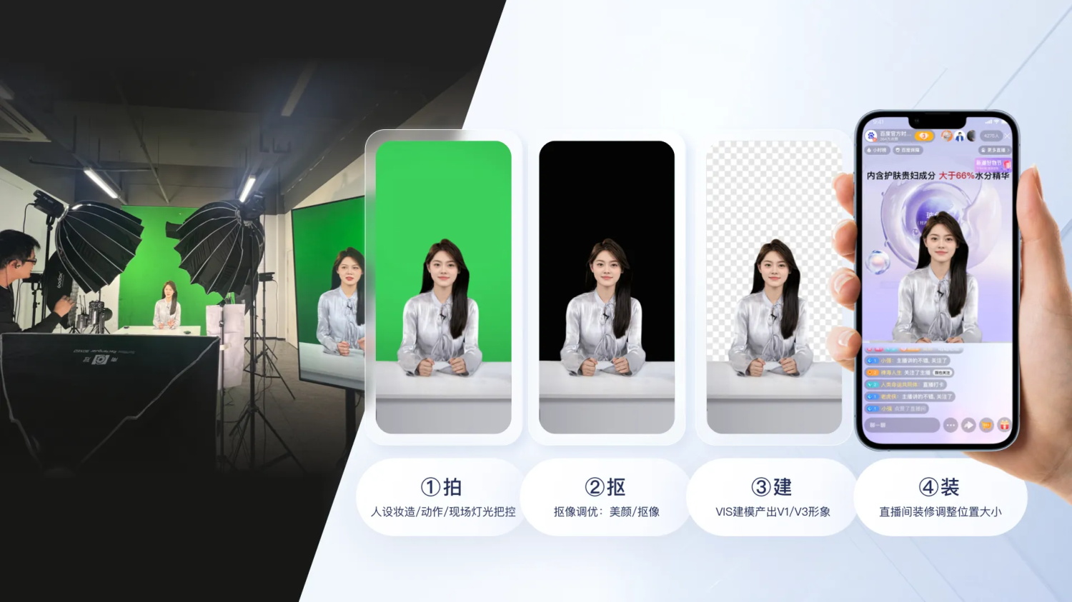 其中,優(yōu)質(zhì)主播形象復(fù)刻通過(guò) 4 步完成:拍攝底板視頻→技術(shù)摳像調(diào)優(yōu)→VIS建模數(shù)字人→調(diào)整數(shù)字人在直播間位置大小。