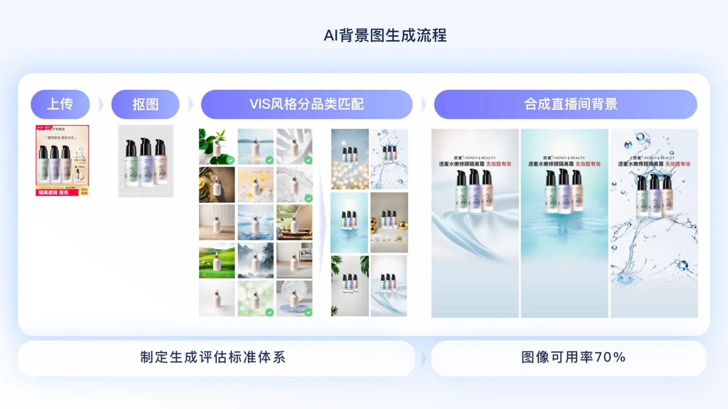 背景圖-AI 生成:跑通 AI 生背景圖流程,商家上傳商品圖→系統(tǒng)自動(dòng)扣出商品主體→VIS風(fēng)格分品類匹配→合成背景圖。