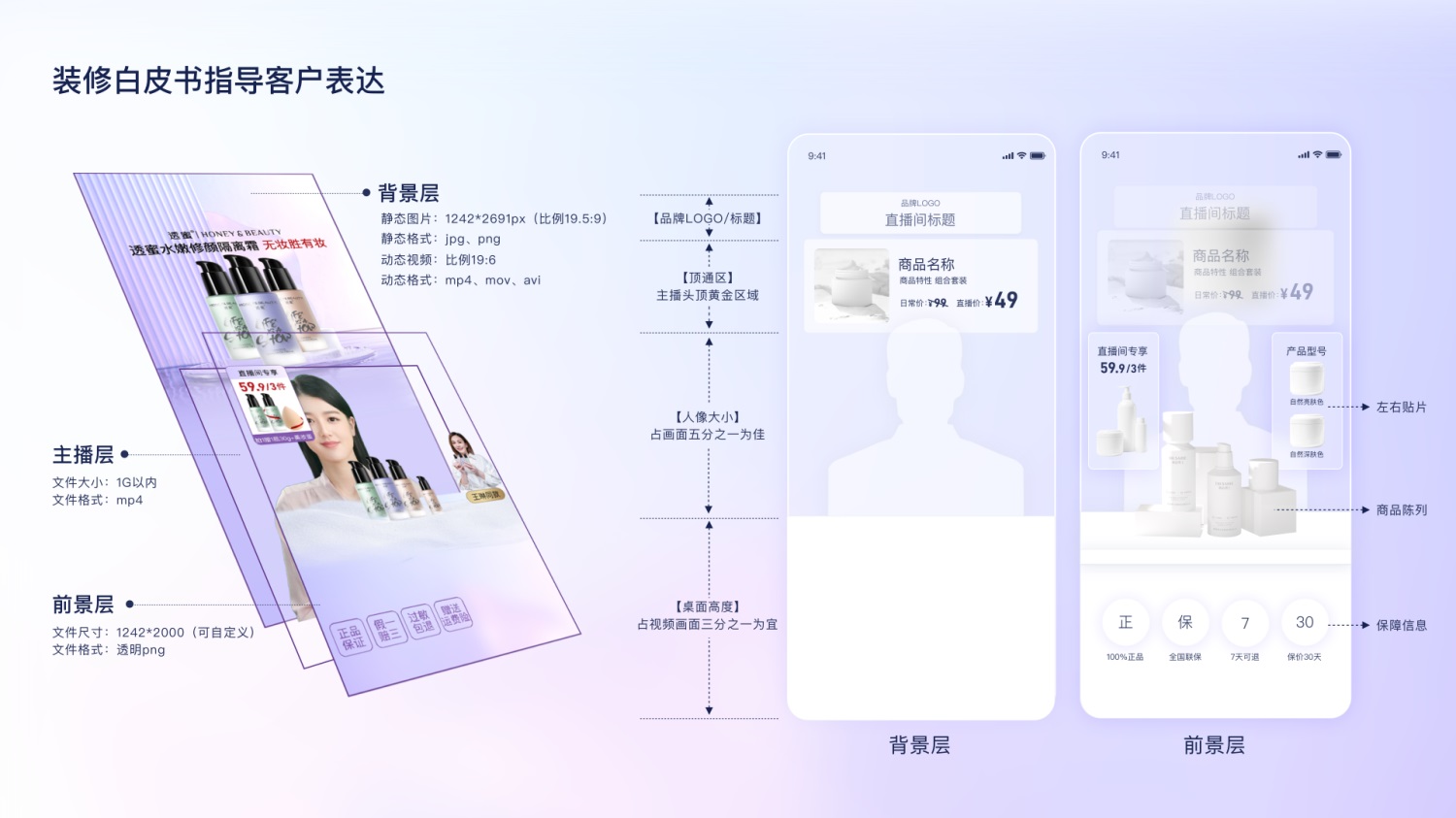 裝修白皮書指導(dǎo)客戶表達(dá):設(shè)計(jì)團(tuán)隊(duì)將直播間分成背景層/主播層/前景層,根據(jù)電商 6 大品類直播間特點(diǎn),分別對(duì)各層特性指導(dǎo)裝修布局,配合公開課的形式,賦能客戶創(chuàng)意表達(dá)。