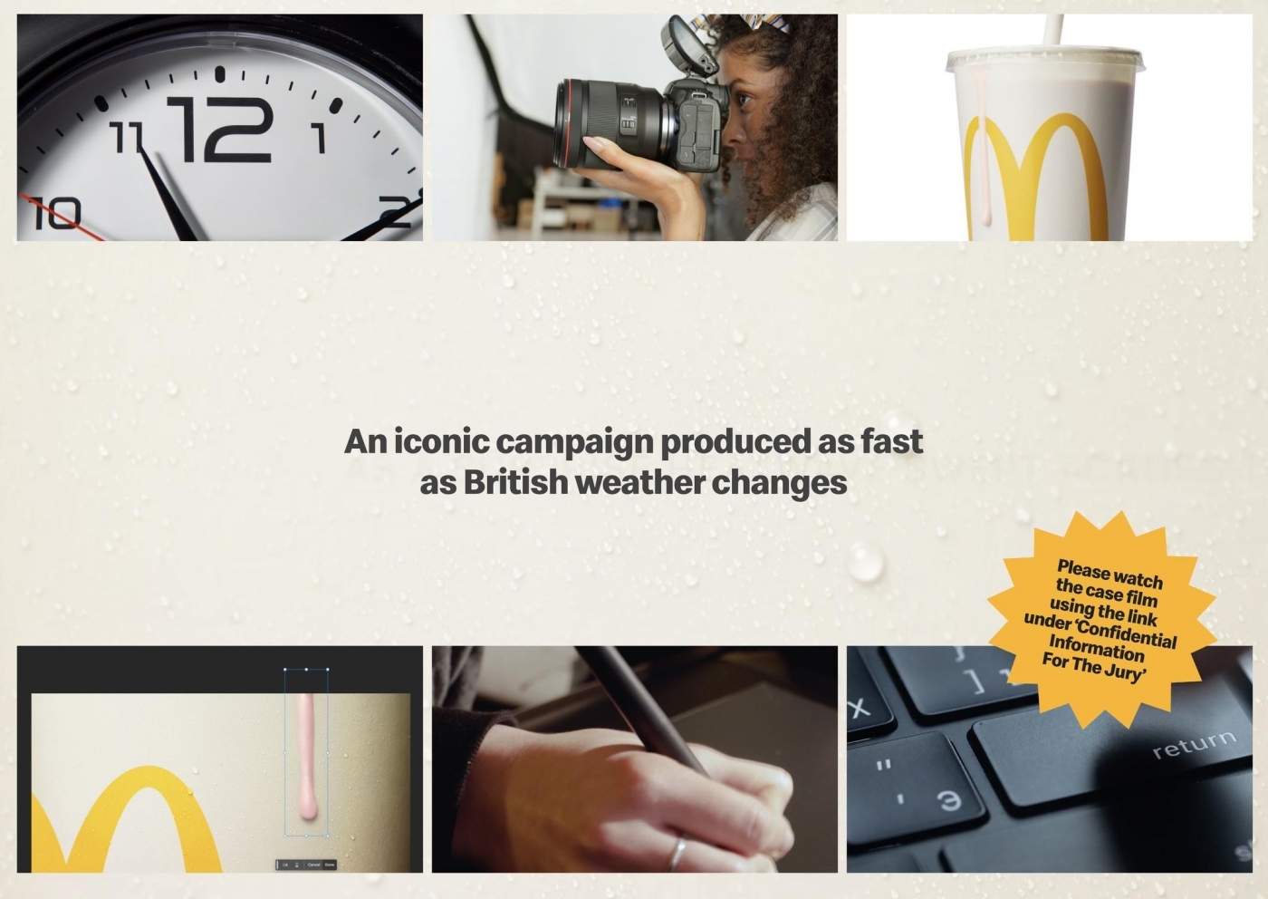 英國的天氣如此不可預測,麥當勞也抓住了這個機會,在戶外立刻張貼了幾張海報。依然是極簡主義風,除了標志性的“M”字logo外,還有隨著氣溫飆升,空氣悶熱而凝結起的層層“汗珠”,以及一滴向下流動的奶昔。