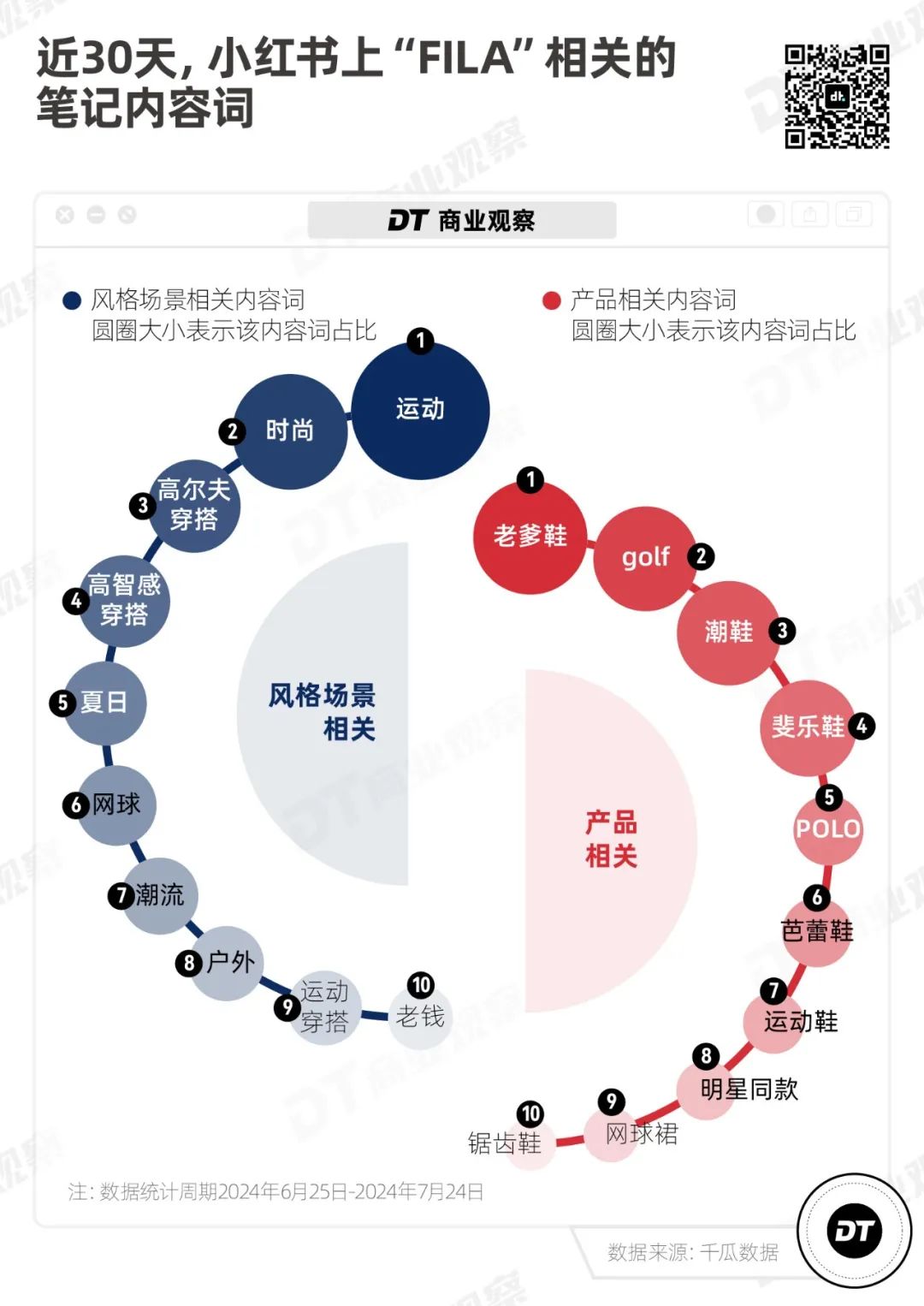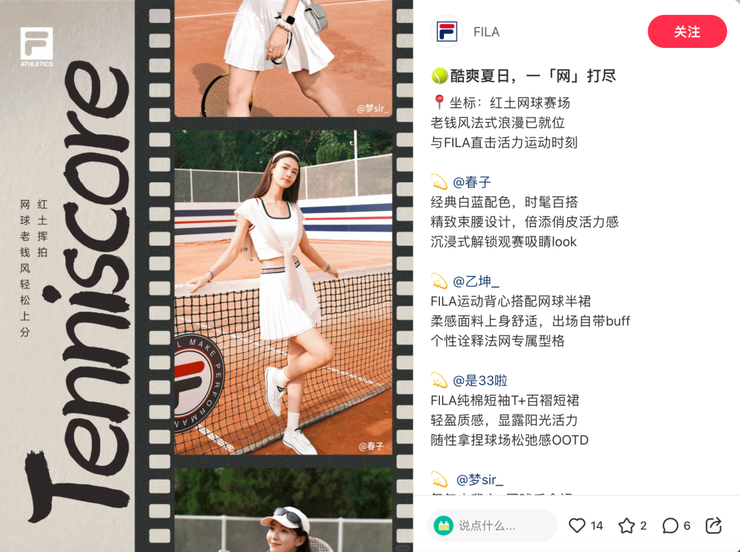在小紅書,F(xiàn)ILA相關(guān)筆記已超過33萬(wàn)篇。不少年輕人被網(wǎng)球老錢風(fēng)、明星同款種草,想從時(shí)髦優(yōu)雅的運(yùn)動(dòng)穿搭中,享受恰到好處的松弛感。有網(wǎng)友開展運(yùn)動(dòng)穿搭的攻略分享,把FILA單品搭配出更多時(shí)尚風(fēng)格,作為“炸街”的流量密碼。