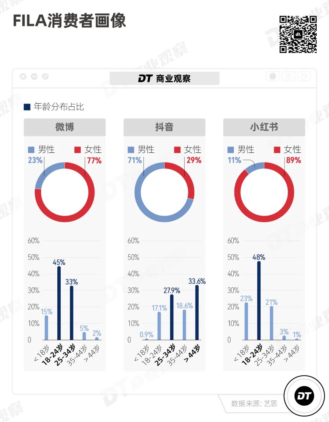 從不同平臺(tái)的人群畫像來(lái)看, 18-24、25-34歲的年輕消費(fèi)人群,正是FILA的主要受眾。
