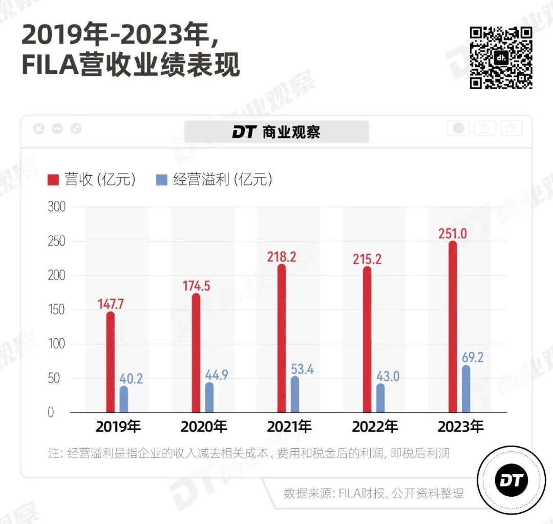 財(cái)報(bào)顯示,2023年全年FILA收益增長(zhǎng)16.6%至人民幣251.03億元,經(jīng)營(yíng)溢利增幅高達(dá)60.8%(經(jīng)營(yíng)溢利是指企業(yè)的收入減去相關(guān)成本、費(fèi)用和稅金后的利潤(rùn),即稅后利潤(rùn))。