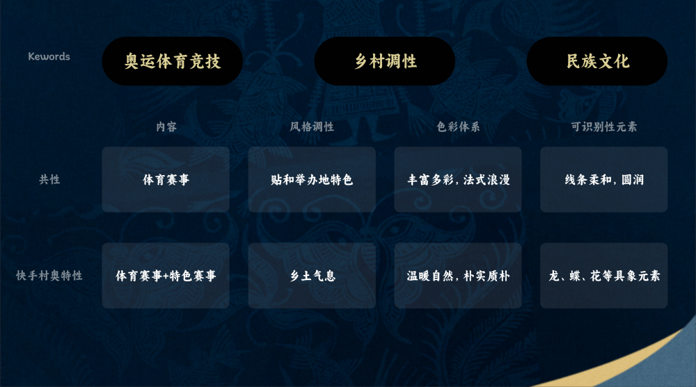 通過以上對比,結合共性與特有性,我們就找到了本次快手村奧的設計創(chuàng)意方向: