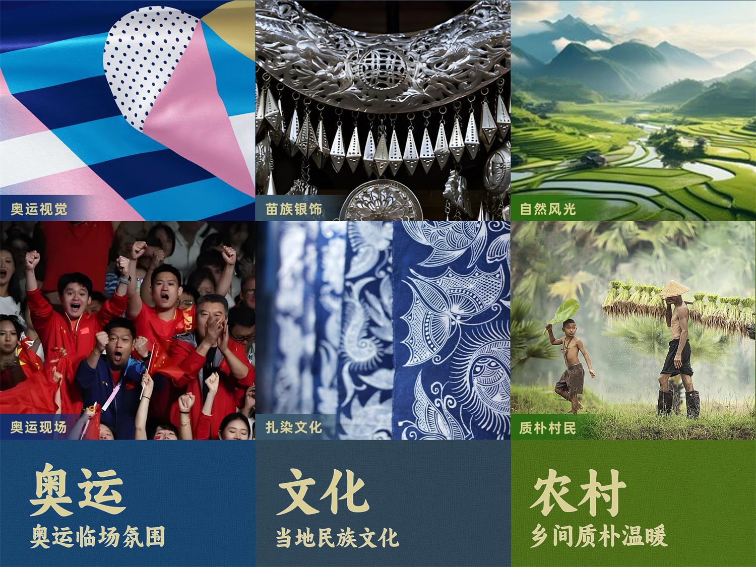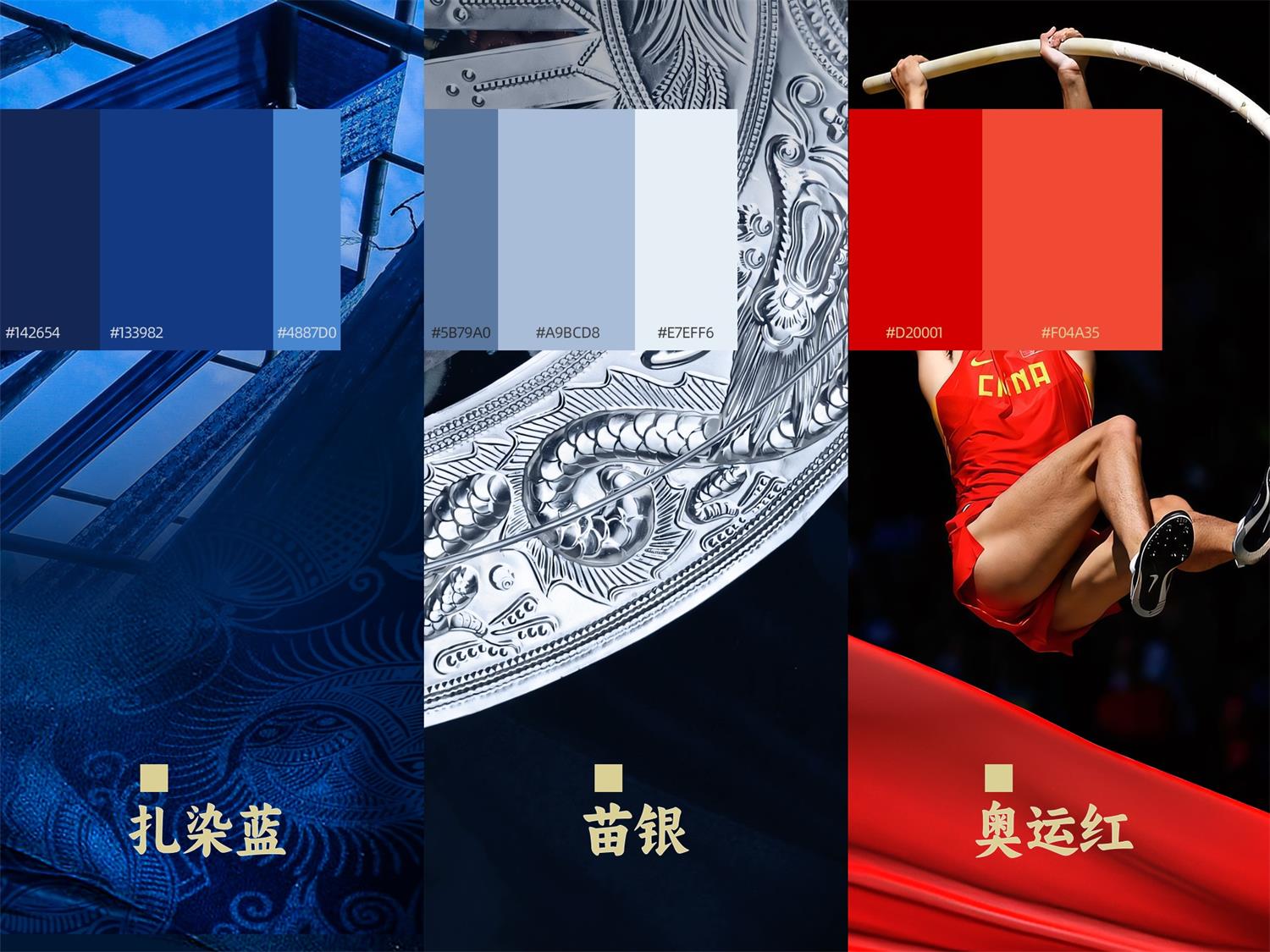 以扎染藍為主體,寓意神秘與智慧。苗銀為輔助色,提升整體的畫面質感和文化內涵。最后,奧運紅作為點綴,突出整體畫面的氛圍感和活力。