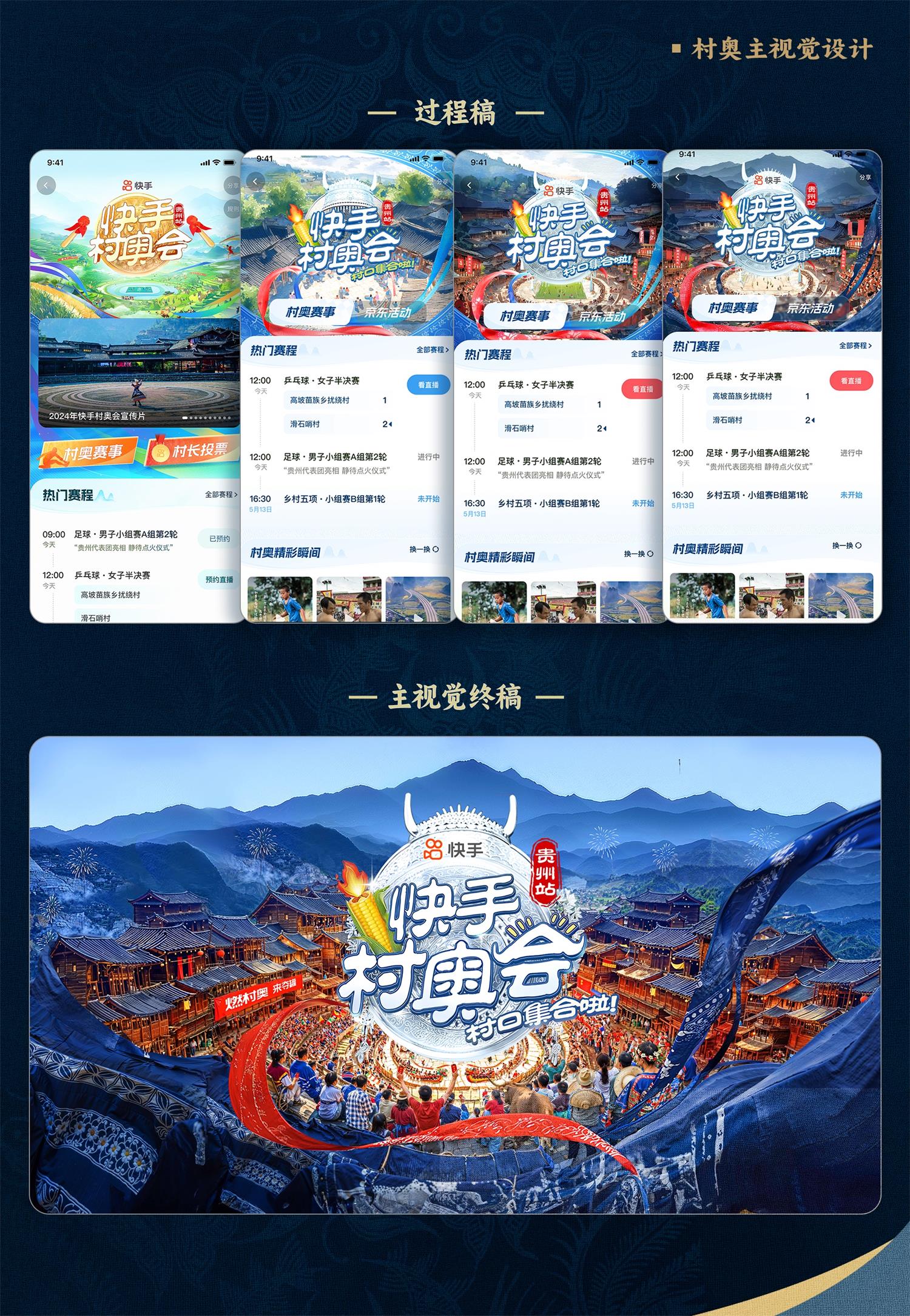 基于快手村奧的特色賽事,結合巴黎奧運調性,通過舒適自然的色彩體系和有地域文化特色的圖形元素,打造差異化,構建出快手村奧的視覺表現(xiàn)。