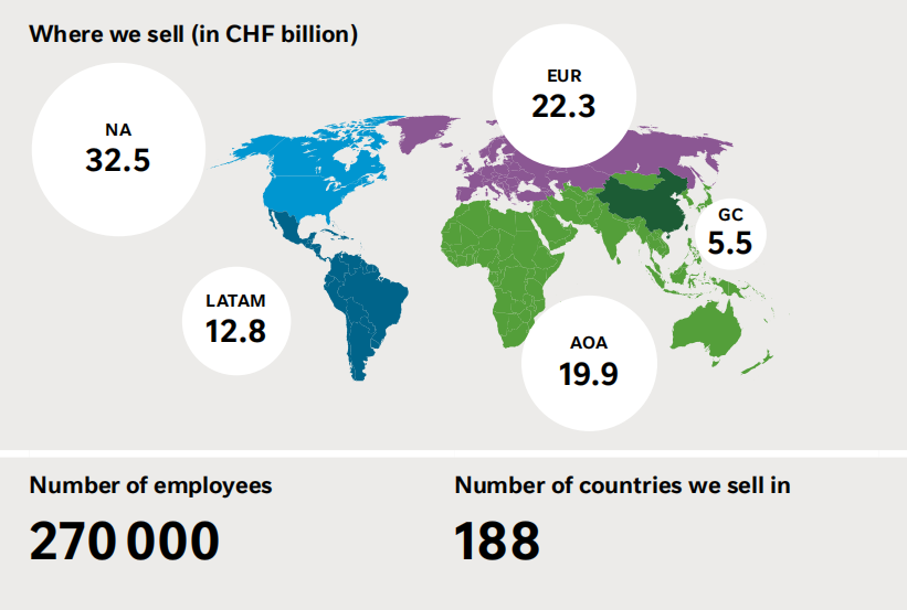 雀巢被稱為最“全球化的企業(yè)”,雀巢在2023年度的營收是929.98億瑞士法郎,相當(dāng)于人民幣7828.94億人民幣(按照2023年12月31日匯率算),而在其本國瑞士的營收是11.01億瑞士法郎,只占其公司總營收的1.18%,其絕大多數(shù)的收入來自于海外。并且,其業(yè)務(wù)已經(jīng)遍布全球,截止2023年,已經(jīng)覆蓋188個(gè)國家,在全球76個(gè)國家有340個(gè)工廠。