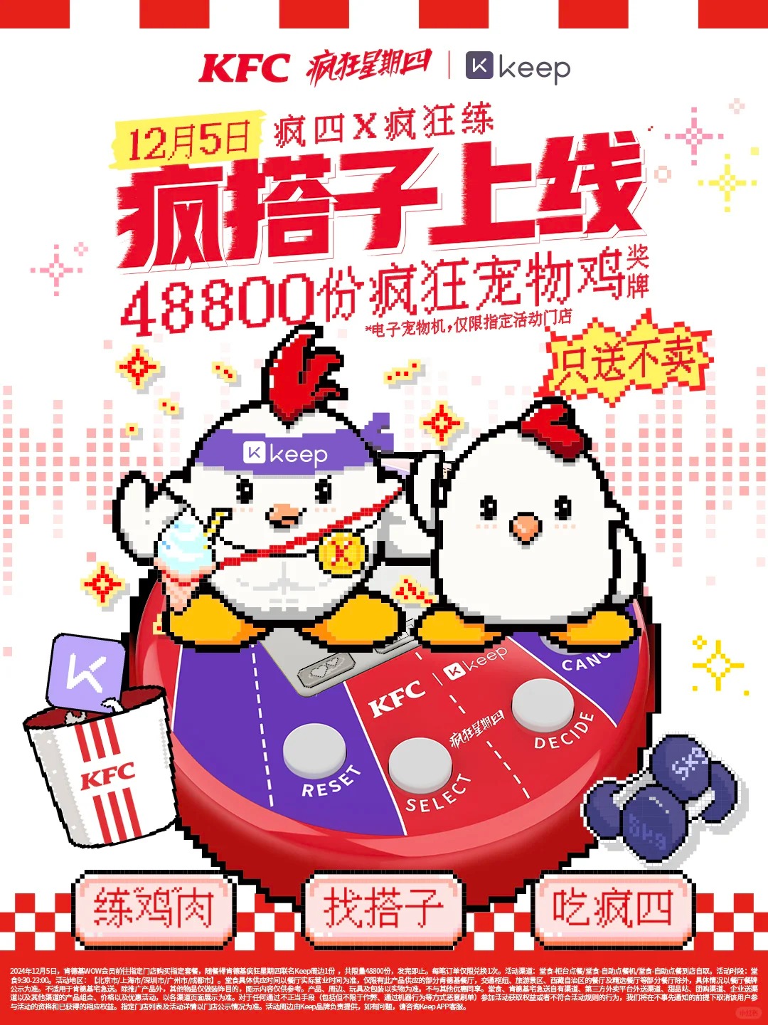 12月5日,肯德基和Keep夢幻聯(lián)動,上線了限量版「瘋狂寵物雞」獎牌,紅藍(lán)配色,滿滿的千禧像素風(fēng),復(fù)古感十足。
