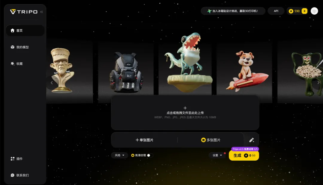 ④ 進入 Tripo3D.ai,上傳在即夢生成的圖片,點擊生成。系統(tǒng)會先構建白膜,然后自動貼圖,最后產出圖片導出使用即可。