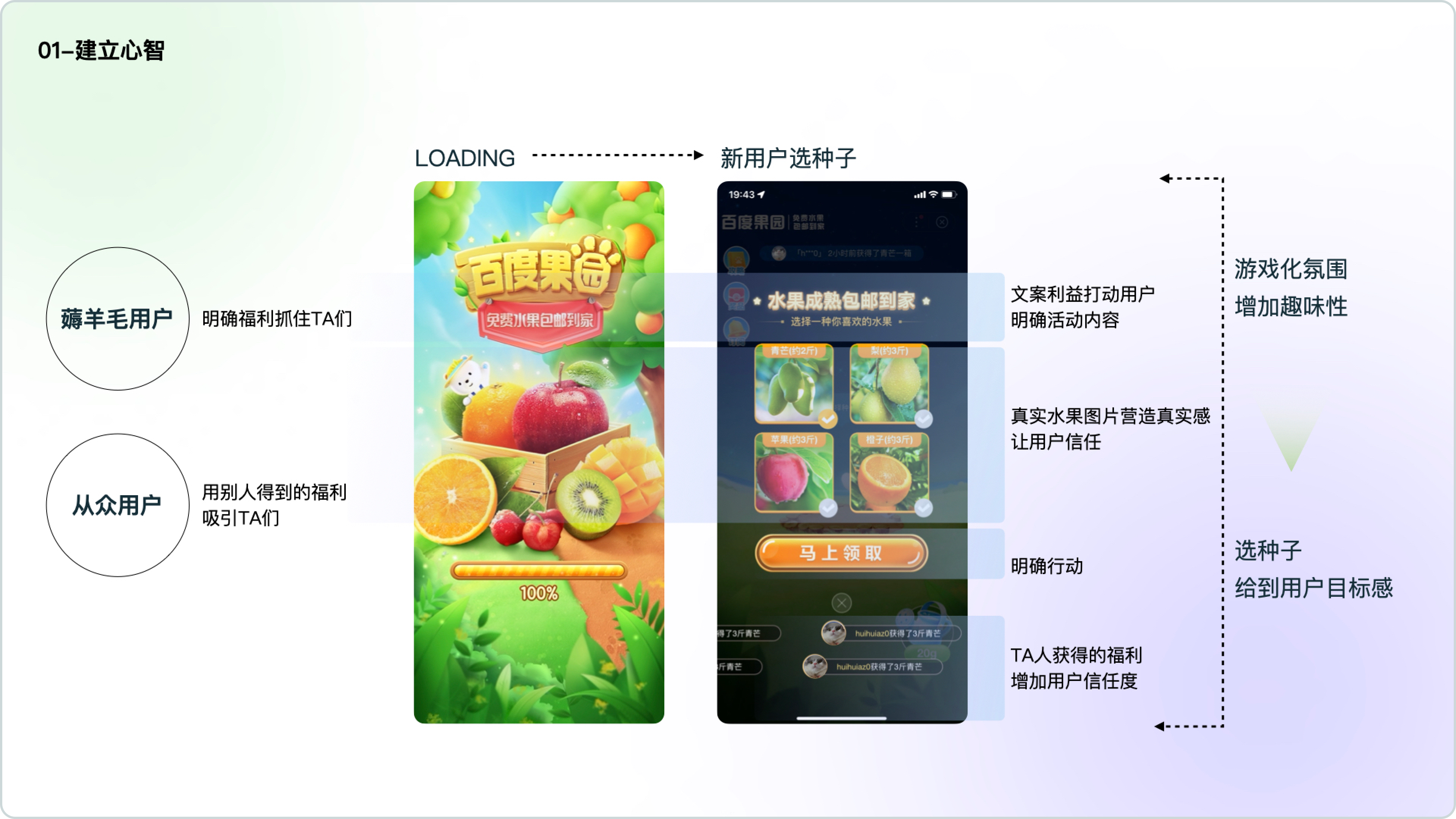 1.建立心智:讓用戶相信百度果園的真實性,愿意參加活動,安全的“薅羊毛”;
