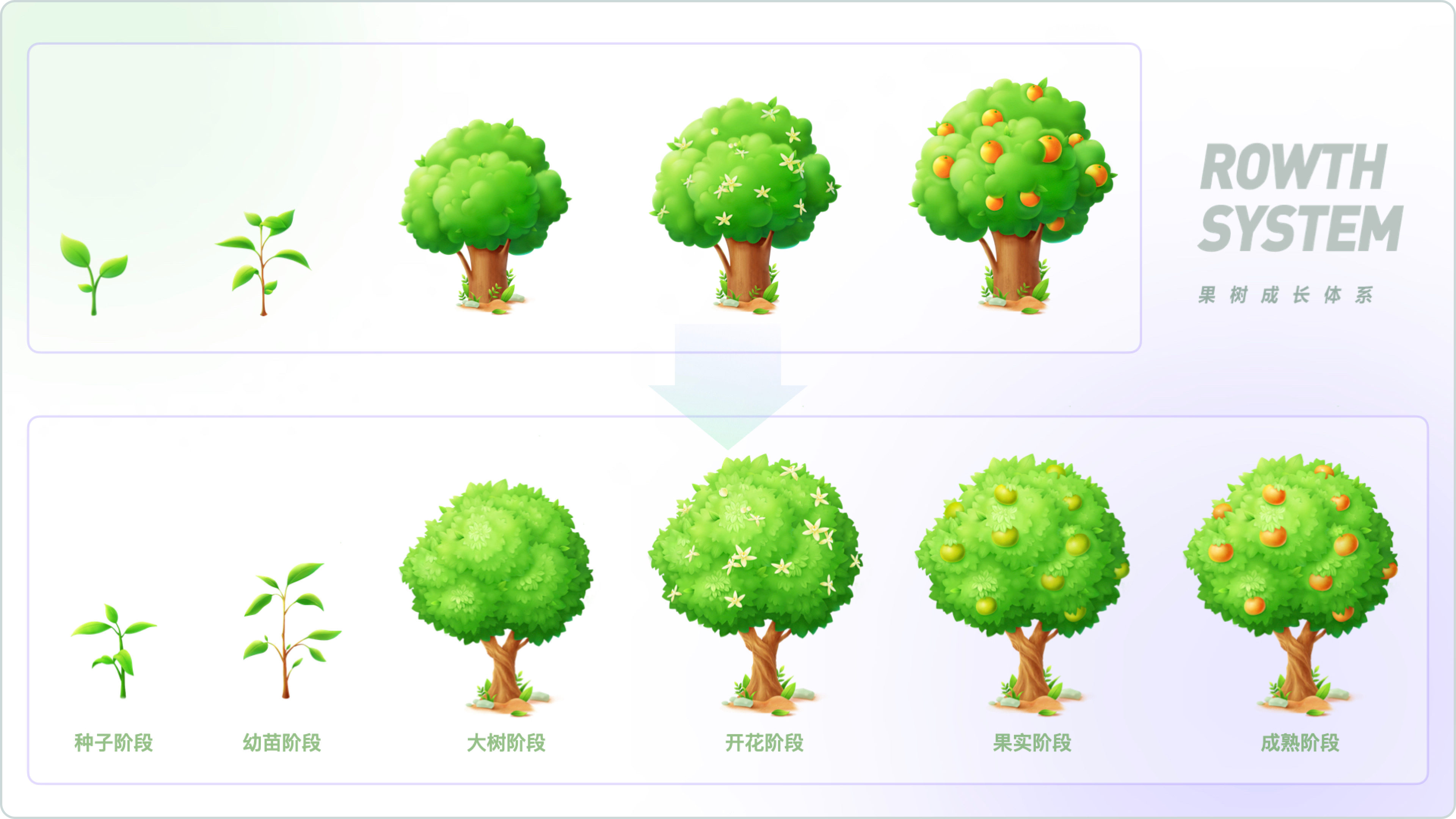 為了營造更加真實的種植體驗,我們在百度果園視覺呈現(xiàn)上也進行了升級,整體視覺效果與真實果樹成長的6個階段(種子→幼苗→大樹→開花→果實→成熟)更加匹配,建立更加真實的果樹成長過程,追求合理性和沉浸感,并且細化每一個不同水果對應的樹、花朵、果實形態(tài),讓用戶在參與活動的過程中體驗果樹成長到成熟的真實感受,也是在視覺效果上形成百度果園的特色。