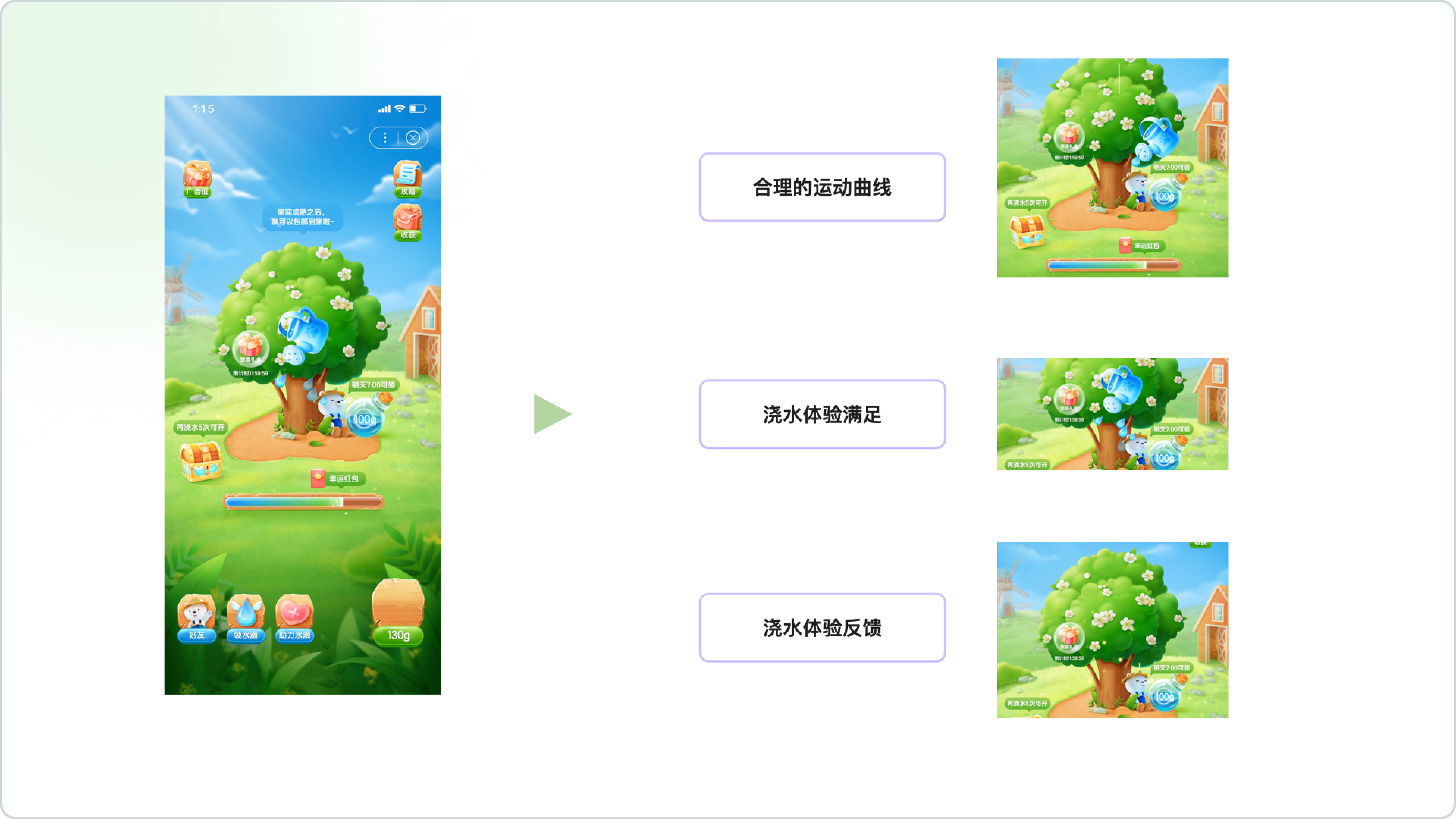 我們在澆水動畫上進行了體驗升級,澆水動畫分前中后3步設計來增加澆水的真實感受: