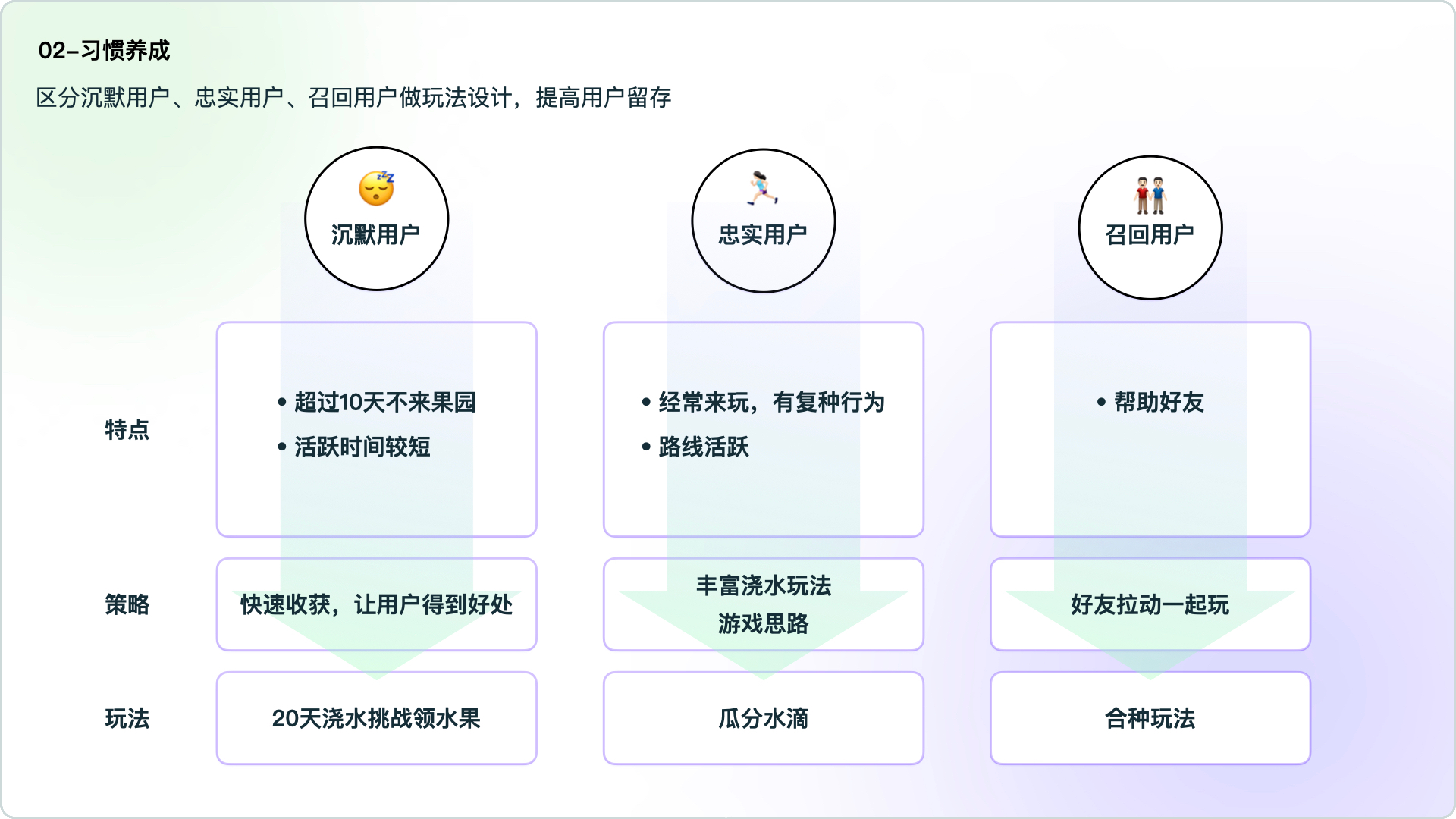 根據(jù)用戶不同的屬性,設計不同玩法讓用戶養(yǎng)成來百度果園澆水的習慣,實現(xiàn)百度APP長期留存的同時讓用戶把“羊毛”薅到手。我們參考百度果園線上老用戶數(shù)據(jù),把用戶分成3類,分別根據(jù)他們不同特點進行針對性的玩法設計: