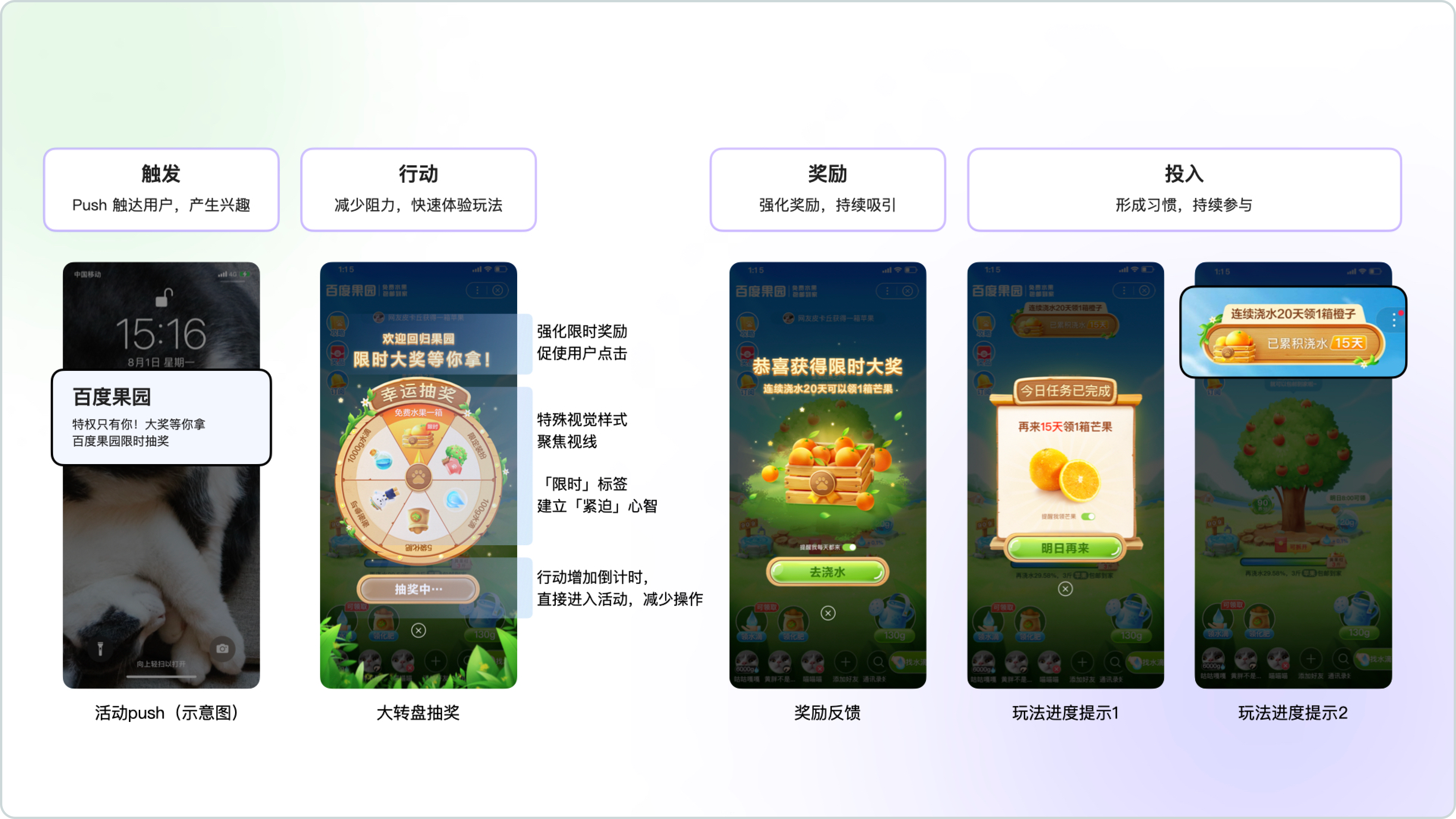 2.養(yǎng)成習慣:根據(jù)用戶不同的屬性,設計玩法讓用戶養(yǎng)成來百度果園澆水的習慣,實現(xiàn)百度APP的長期留存同時把“羊毛”薅到手;