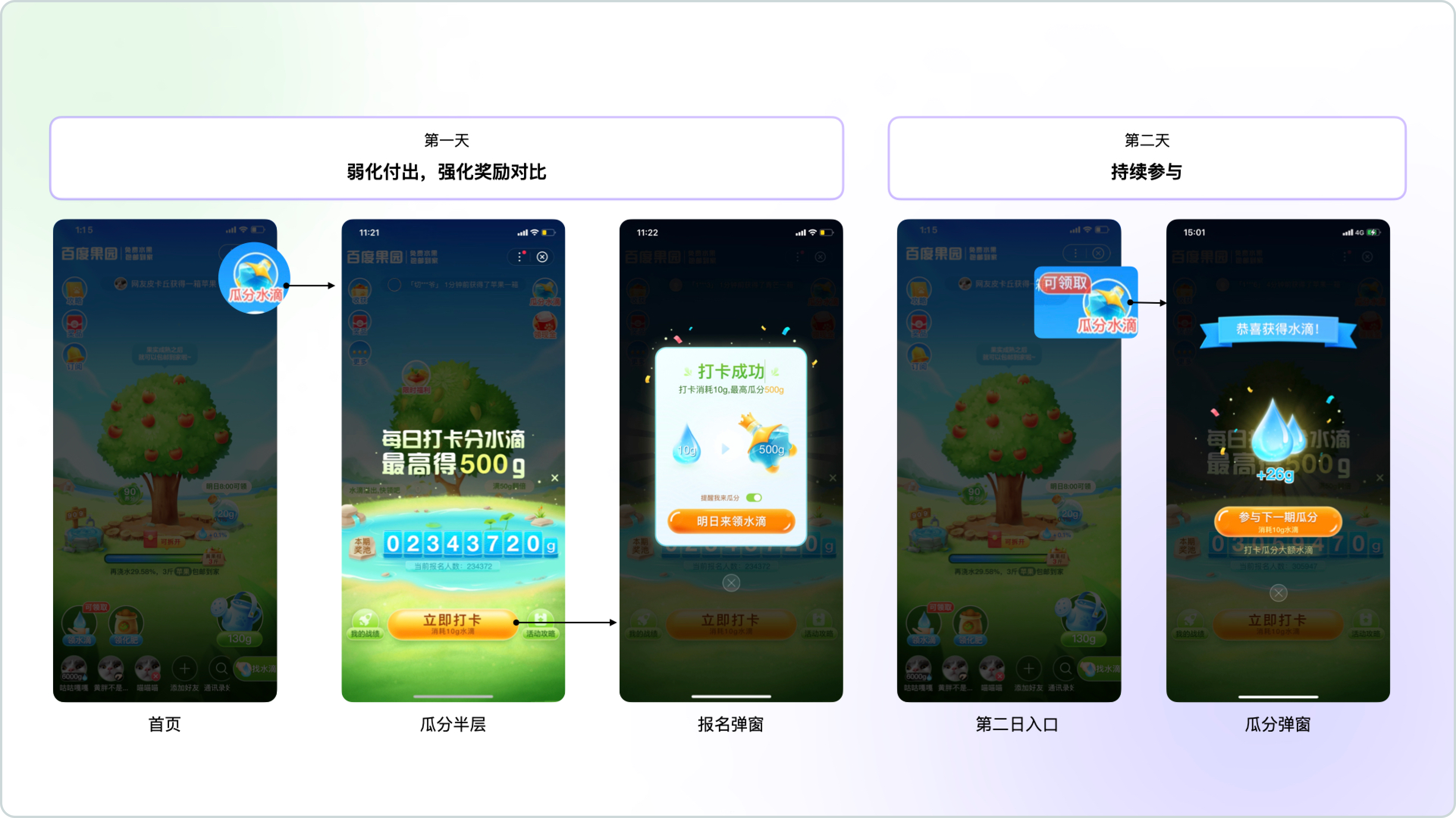 百度果園是一個長線養(yǎng)成類運營活動,為了讓老用戶持續(xù)保持新鮮感,我們在果園里增加具有趣味性的「瓜分水滴」玩法,是參與兩日就可獲得獎勵的輕量化的玩法。第一天用戶進入「瓜分水滴」活動,通過大額水滴獎池吸引用戶的注意力,提起用戶的參與興趣,在行動操作上弱化付出成本突出行為動作,引導用戶點擊;用戶報名后及時提醒用戶打開訂閱增加觸達場景;并在彈窗上對付出成本與收獲回報進行對比,吸引用戶第二日再次打開百度果園參與領獎;在領獎的同時直接引導報名下一期活動,持續(xù)拉動用戶回流。