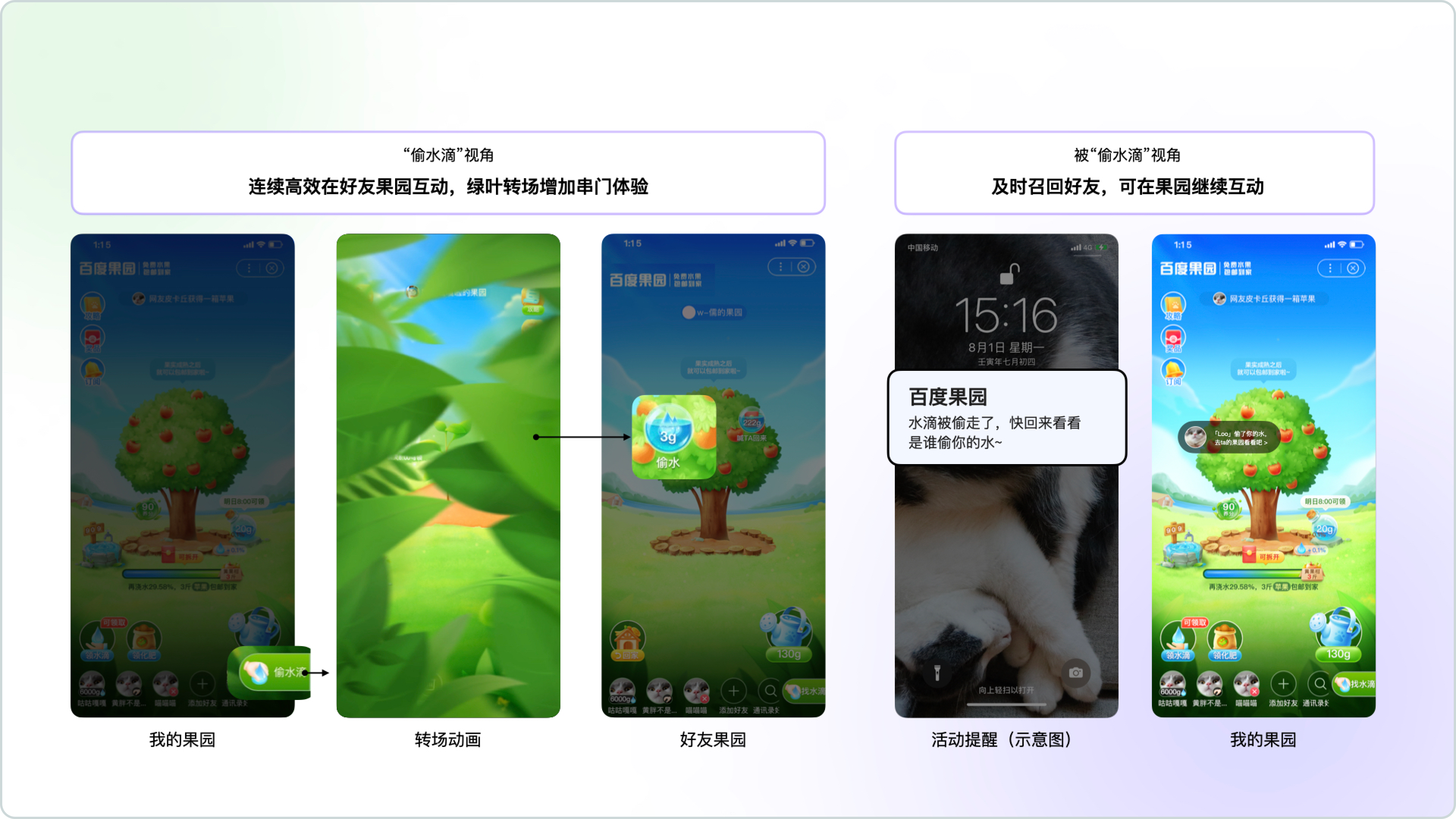 為百度果園賦予情感與故事性,好友社交上分兩步探索,第一步引導用戶去“偷”好友的水滴,在好友之間持續(xù)互動,水滴是貫穿百度果園整體玩法的重要代幣,好友的水滴被“偷”,就降低了好友“薅羊毛”的速度,但對用戶自己來說,“偷”水也需要“偷”的高效,我們在果園里增加了連續(xù)“偷”水動作,邊“偷”水邊把好友喊回來;為了豐富用戶的體驗感受,在好友果園跳轉(zhuǎn)之間增加了樹葉遮擋的動畫效果,動畫轉(zhuǎn)場同時也是替代小程序白屏轉(zhuǎn)場的好思路,營造了好朋友在果園之間串門的感受。