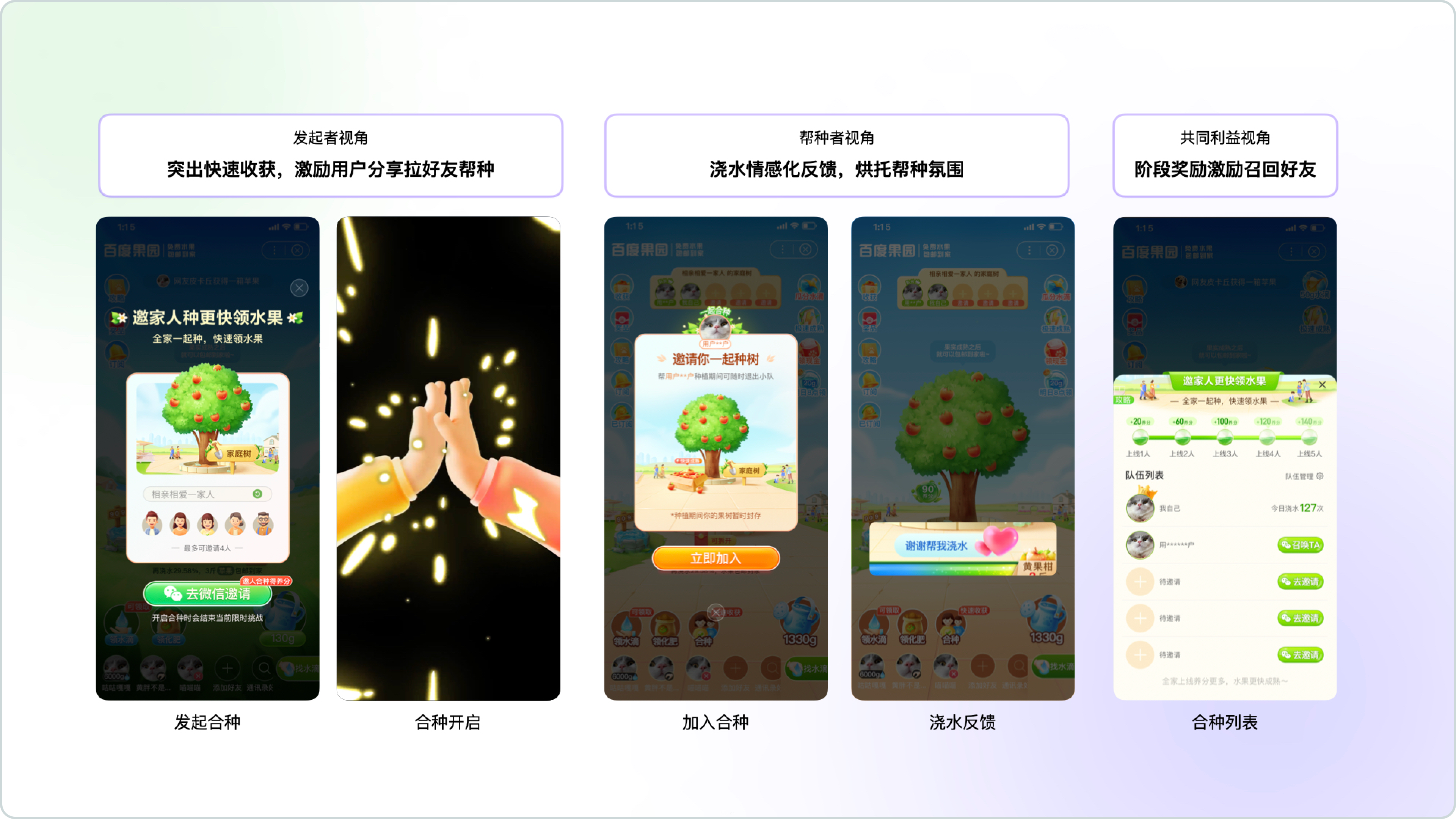 第二步好友互動持續(xù)升級,通過家庭合種的概念加強用戶之間的聯(lián)系,情感化的方式來提升用戶主動參與意愿,拉動身邊親朋好友一起加入“薅羊毛”的隊伍,一方面幫助用戶提升領水果的速度,另一方面也幫助百度果園在用戶上實現(xiàn)破圈。在玩法設計上我們區(qū)分3個視角進行設計: