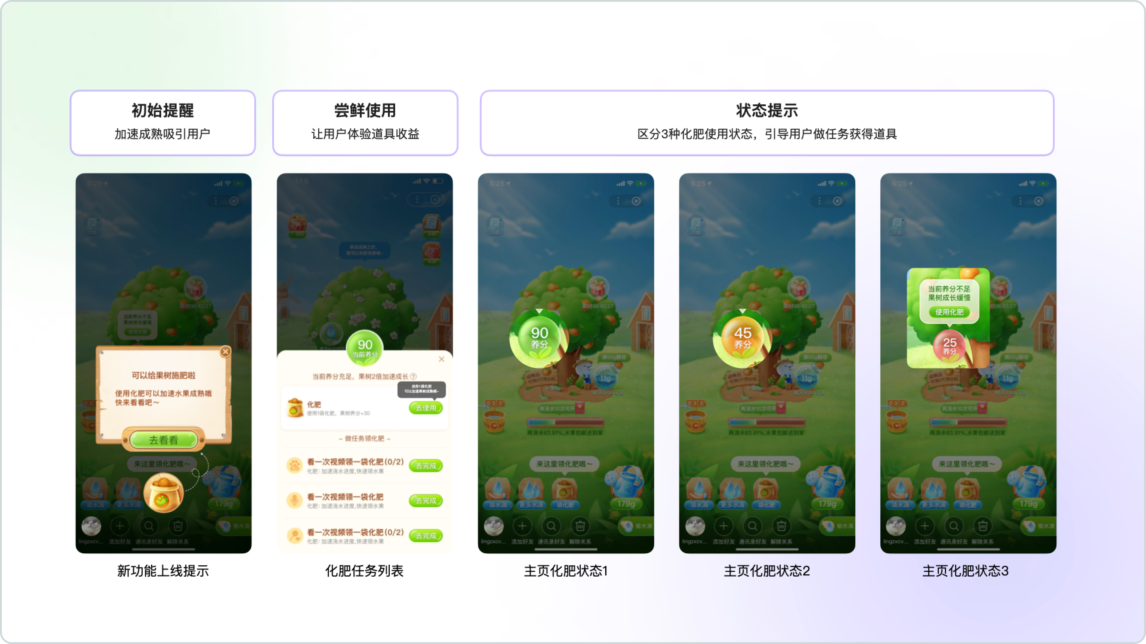 結(jié)合百度果園自身可落實上,我們優(yōu)先在可以提升用戶澆水效率,幫助用戶快速拿水果的道具進行試水,結(jié)合線下實際生活中的種植場景去思考,所以我們將道具名稱與玩法設定為「化肥」,在種植中增加化肥收益,提升果樹的種植進度,讓百度果園在玩法上更加生活化。