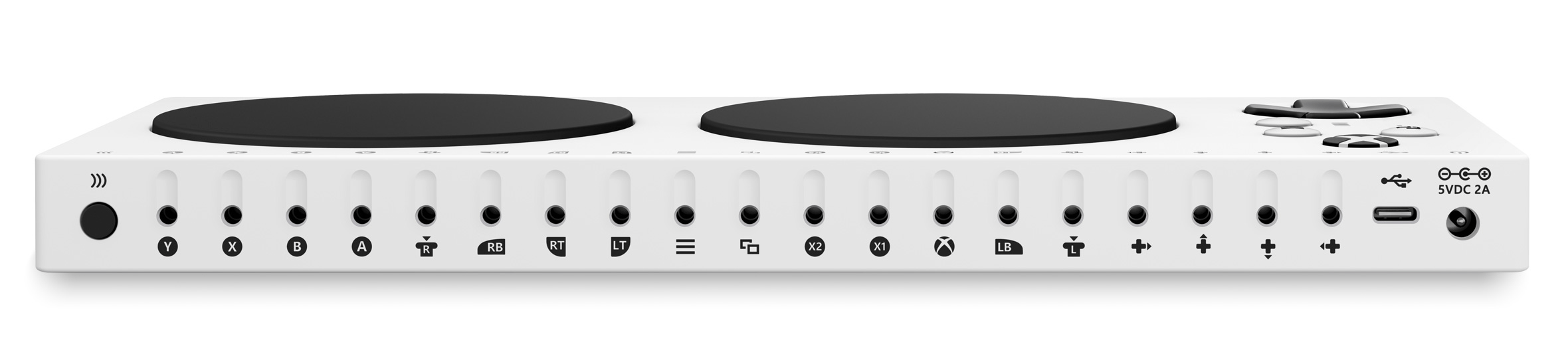 而它應對類型繁多的肢體殘障用戶需求的核心,則藏在它的背面,19 個標準 3.5mm 接口,搭配左右兩側(cè)的 USB 接口,它可以接駁市面上絕大多數(shù)的第三方無障礙控制器,比如 PDP 單手操縱桿、高靈敏度的按鍵模組、用嘴進行操控的 Quadstick 以及頭戴式按鍵組件。
