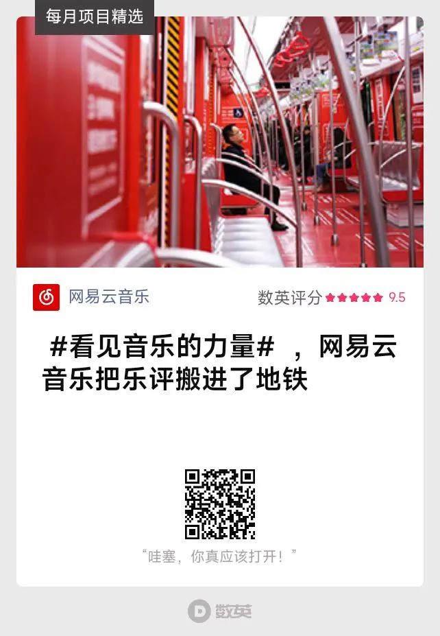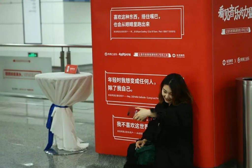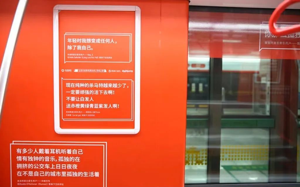 2017年,一輛刷滿紅白顏色的地鐵駛入大眾眼簾,也走進大眾心中。網(wǎng)易云音樂將社區(qū)中高贊且?guī)в袧庥羟楦械脑u論置于地鐵內,借助封閉的空間和夜晚的場景讓情緒感染加速。