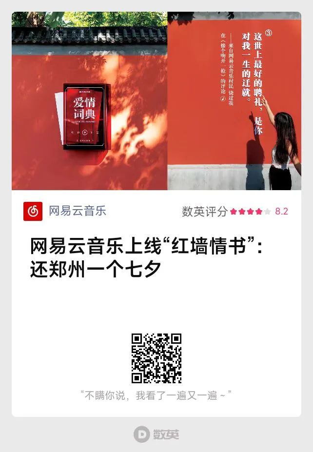 同年9月,因為一場暴雨錯過的七夕,網(wǎng)易云音樂把浪漫給補上了。雨過天晴,在鄭州“連心里”胡同,網(wǎng)易云音樂用20條樂評組成一本《愛情詞典》,從曖昧、相知到婚姻,這些感人瞬間被印刻在紅墻上,陪著人們找到愛情的答案。
