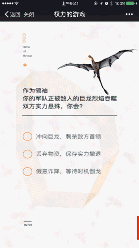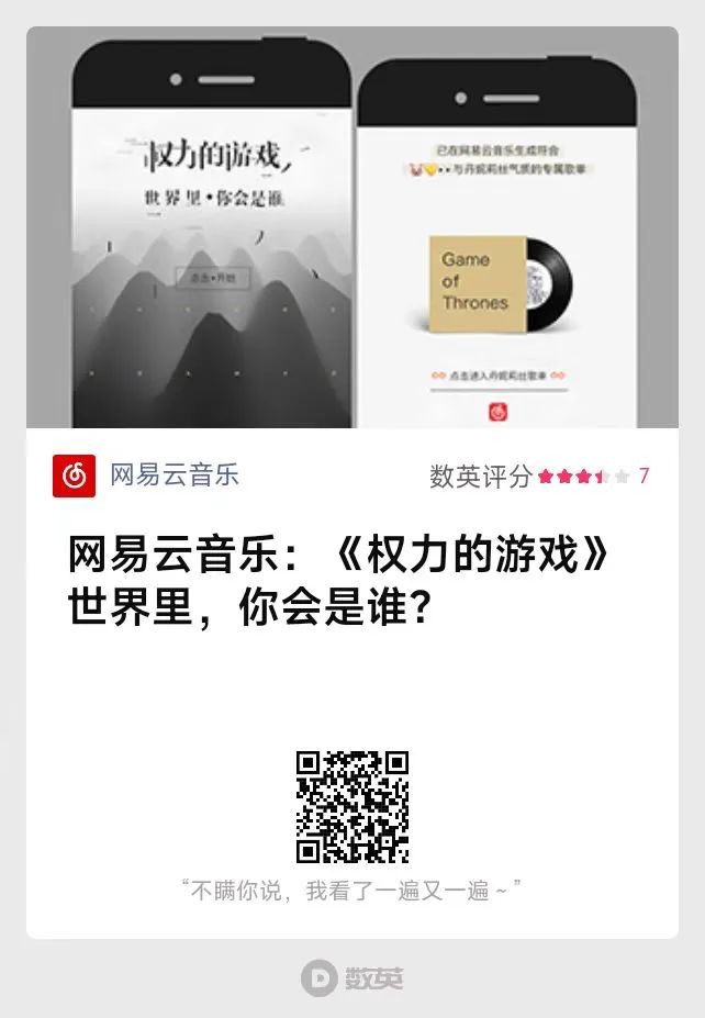 《權力的游戲》快要進入終章時,網(wǎng)易云音樂巧妙借勢,以6道測試題調動粉絲情緒。精細的UI設計,伴著冰原狼的嚎叫和巨龍振翅的響聲,沉浸式的劇情氛圍和妥帖對應的角色歌單,誠意之下,更讓用戶看到了云村內豐富的歌單資源。