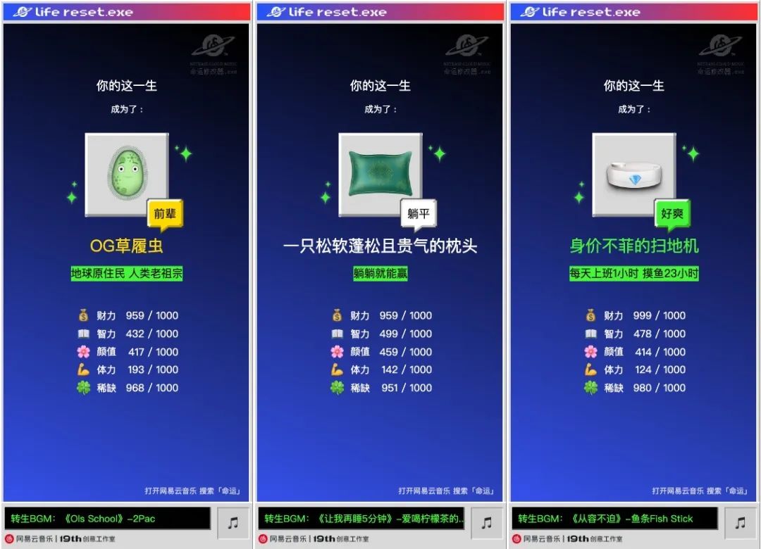 4月1日愚人節(jié),是各大品牌腦洞大開的時候。針對年輕人“內卷、躺平”的社會情緒,網(wǎng)易云音樂把主意打在了人的命運設定上,給人一次“重生”的機會。當“命運”這類宏大的主題被解構,當生活壓力以詼諧戲劇化的方式化解,人心的活力則得以滋生。