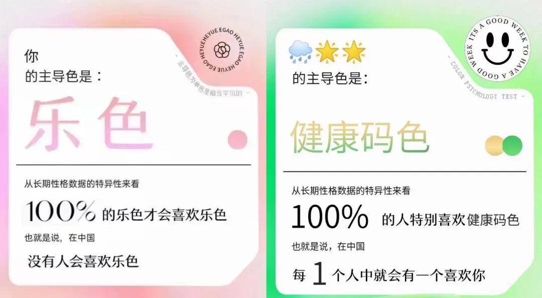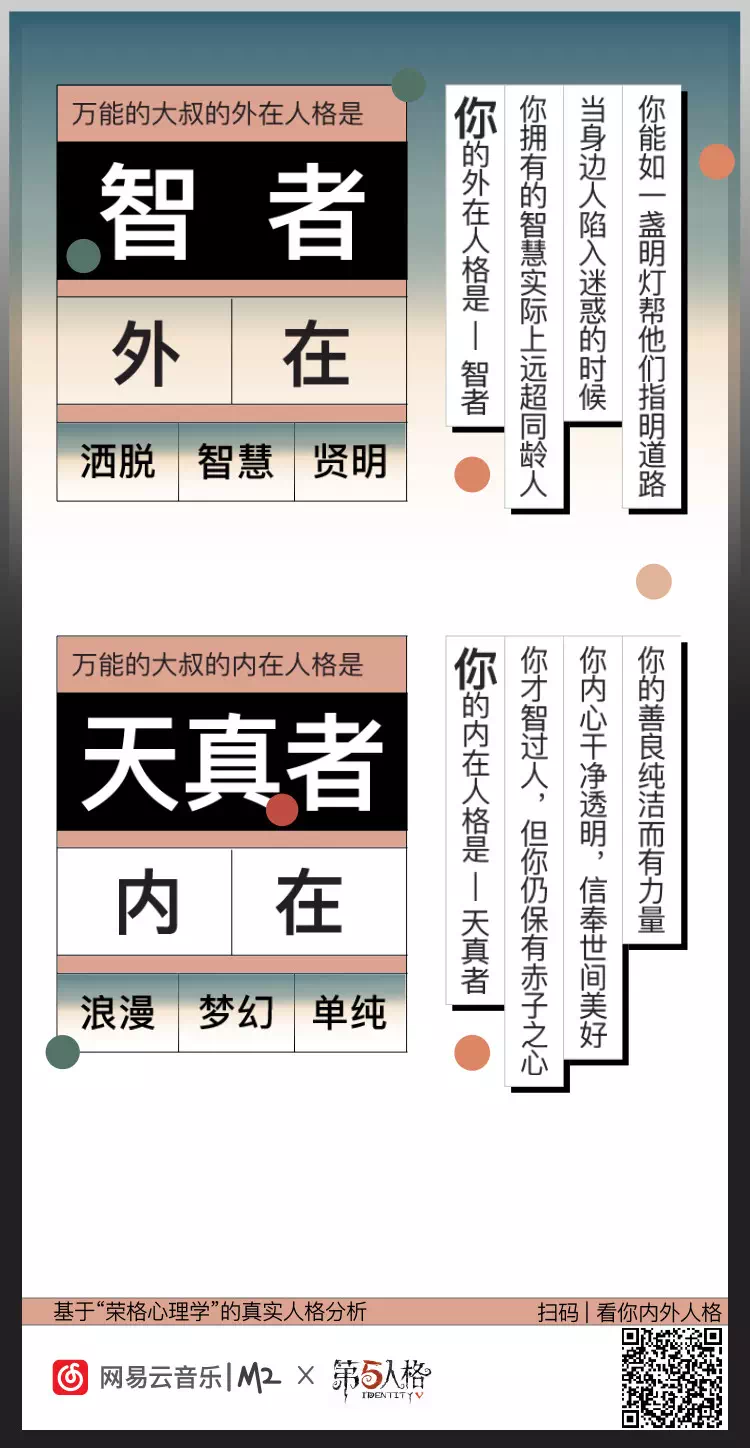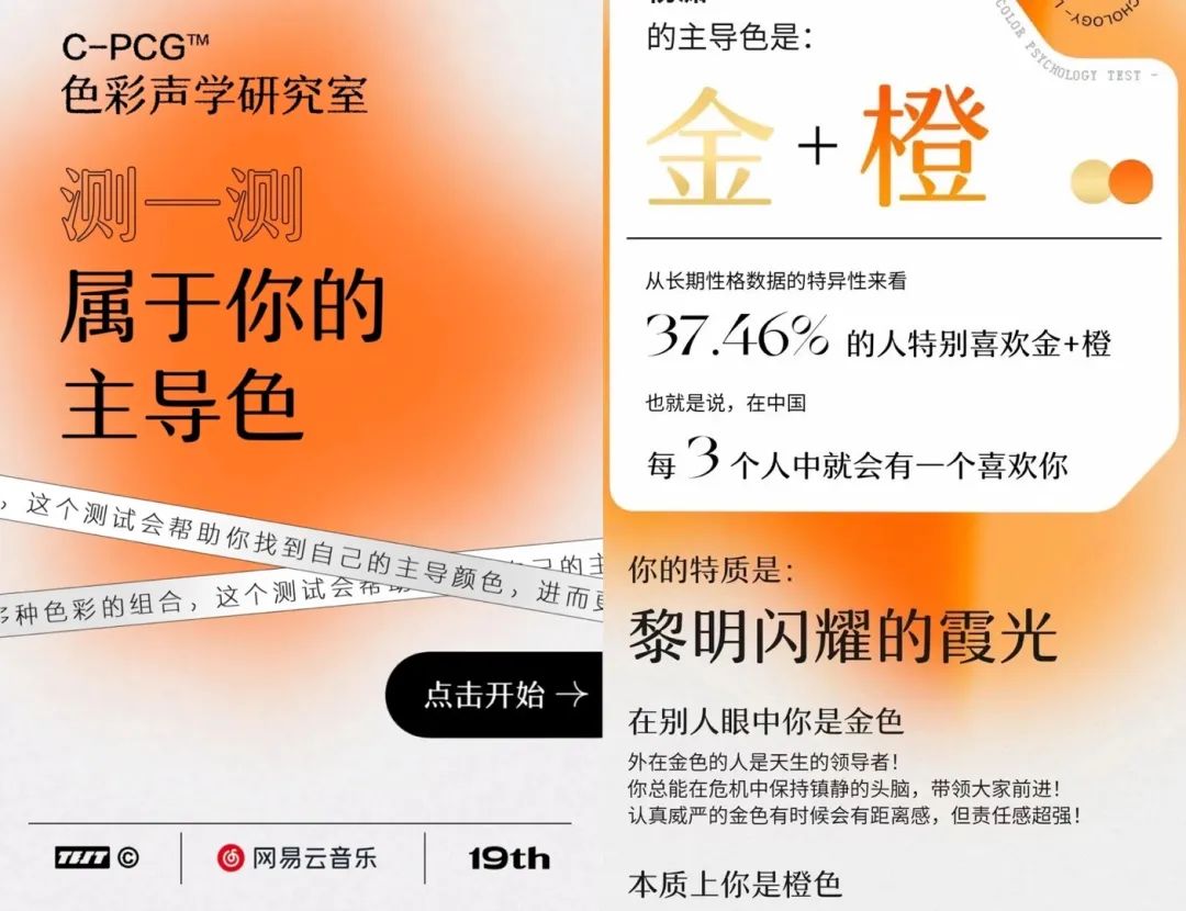 同樣是性格測試,網(wǎng)易云音樂又找到一個專業(yè)說法:美國心理學家Tom Maddron的著作《最準確的性格色彩測量工具》。色彩之間的多樣搭配,讓性格特征可精準解讀,賦予每個人獨特性;“吸引”與“遠離”的區(qū)分,留足了互動和二創(chuàng)的空間。