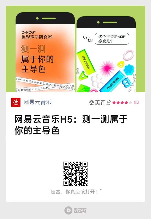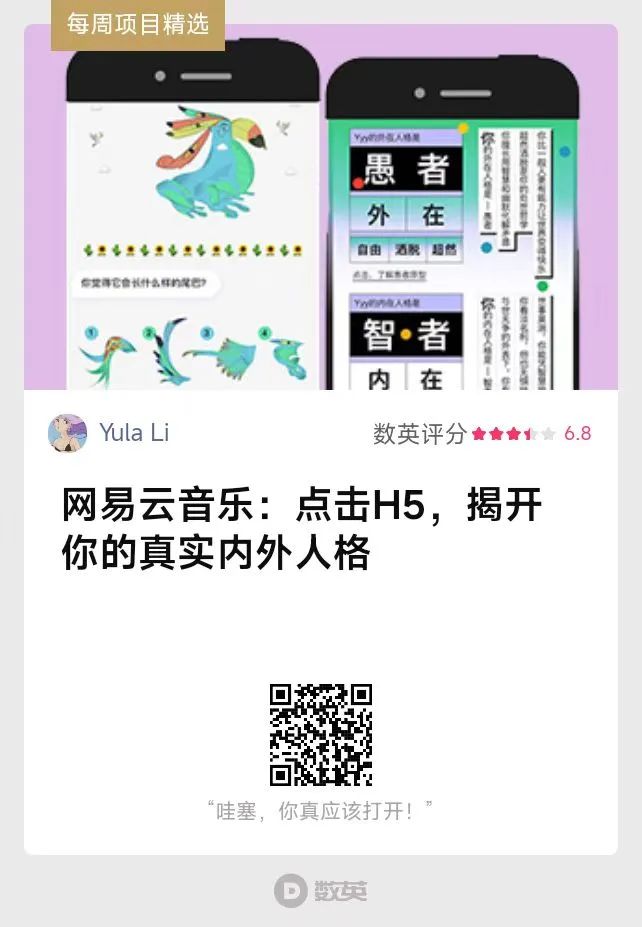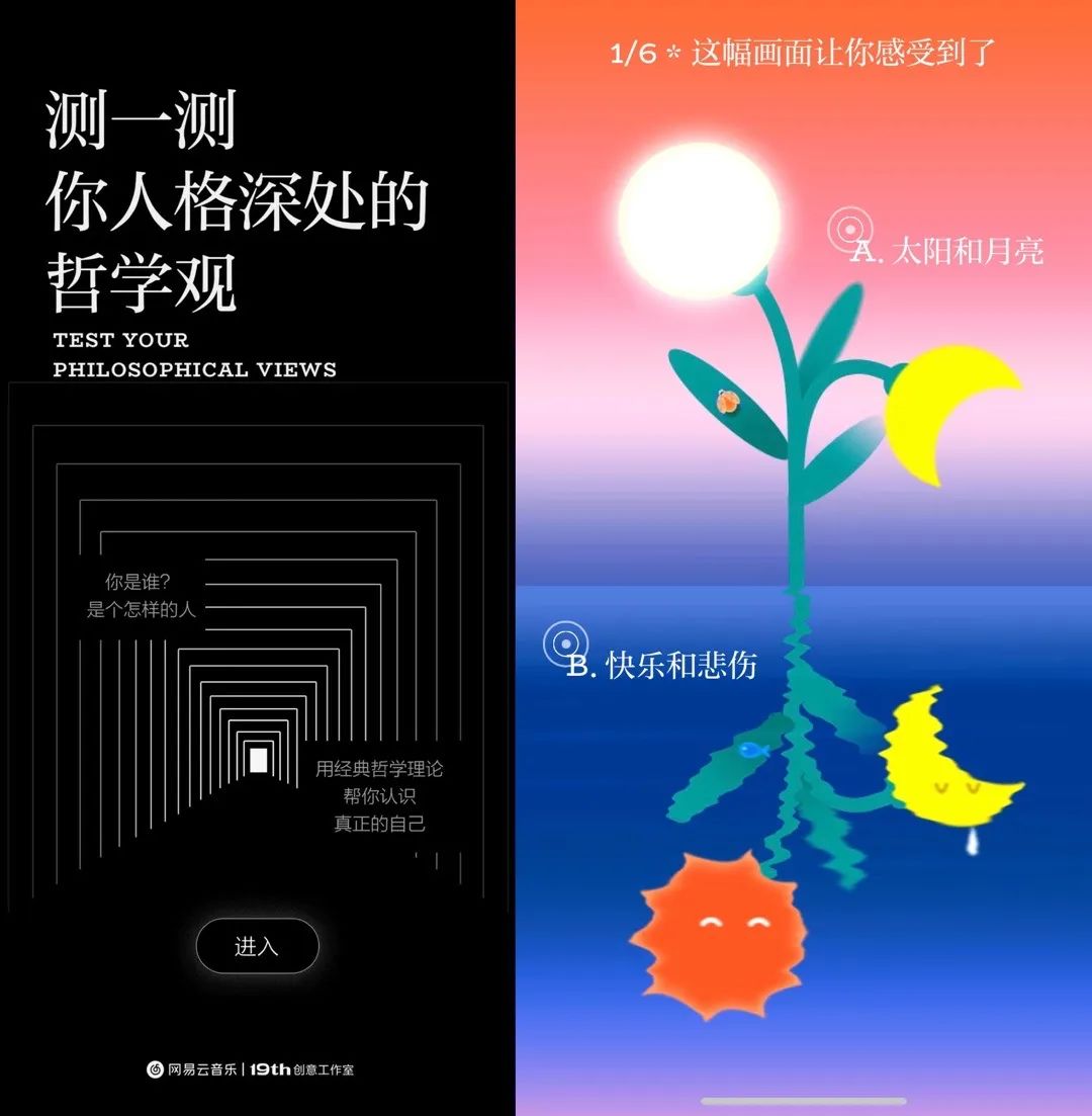 網(wǎng)易云音樂依據(jù)“榮格心理學”打造出一套人格測試。H5通過對話的形式,讓整個測試過程有了呼吸空間和趣味性。最后以“定制款”的音樂推薦,戳中個人情緒點,加深用戶的個性表達。