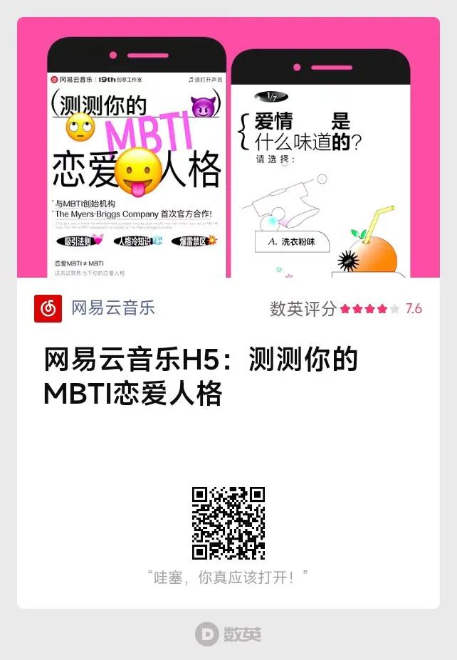 MBTI正刷屏各大社交網(wǎng)站,網(wǎng)易云音樂的測試也緊隨其后霸屏朋友圈。520粉紅氣氛正濃,手握“戀愛”與“MBTI”兩大流量密碼,網(wǎng)易云音樂幫助陷入情感煩惱的人們找到戀愛的理想型。浪漫華彩的溢美之詞,直接把人夸到了心坎里。