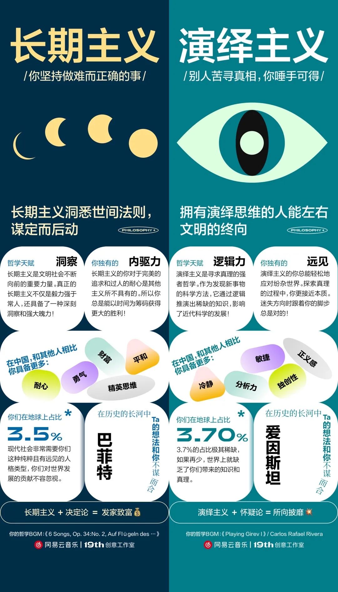 認識自我遠不止一種途徑,哲學也是可選項。網(wǎng)易云音樂把哲學掰成了6個問題,還用一位哲學人物與之匹配,讓人對這門艱深晦澀的理論有了直觀認識。當測試結果分享到社交平臺時,哲學自帶的高知與高深特性,順便成了用戶人設的裝裱。