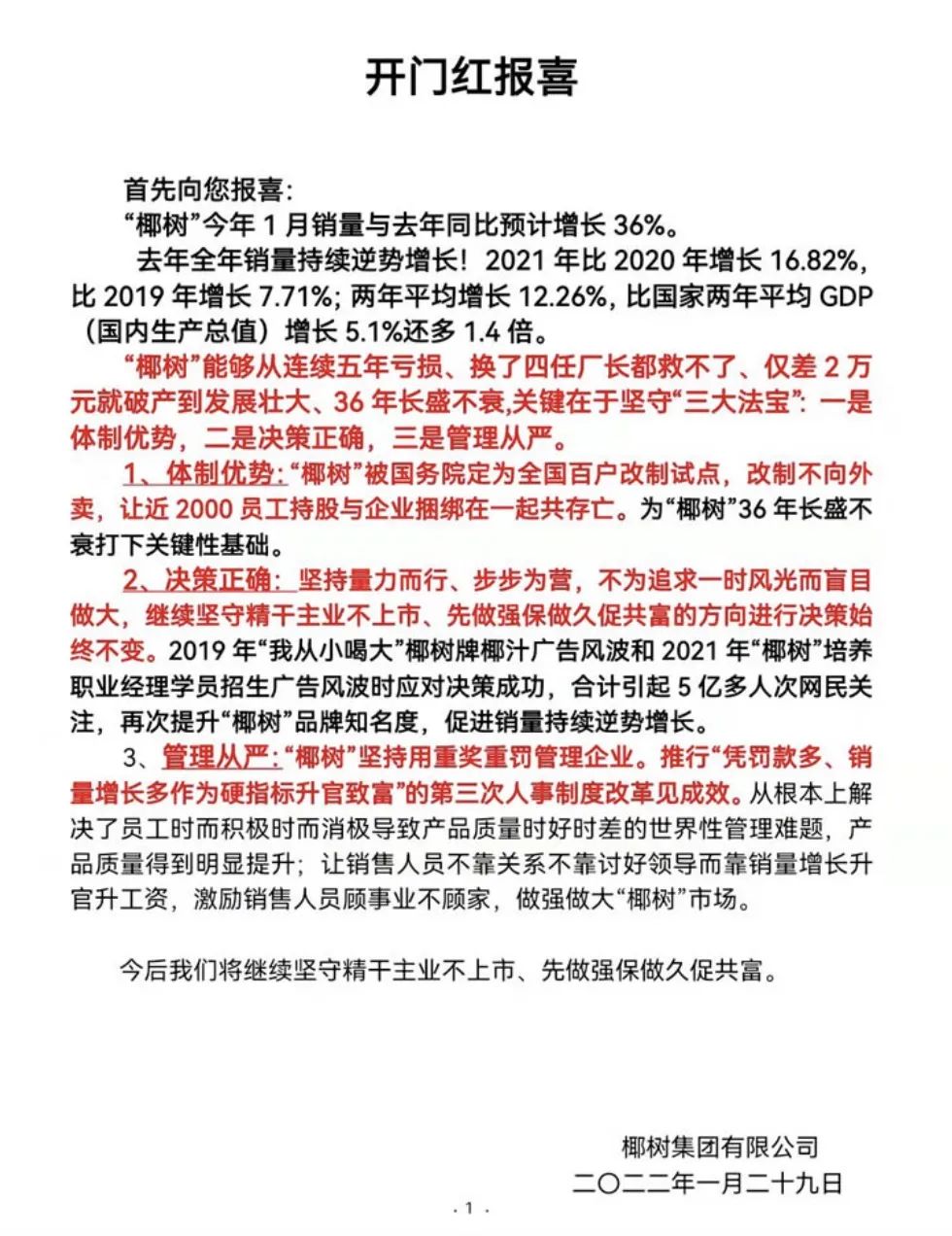 單一產(chǎn)品,是椰樹集團(tuán)最常被提到的局限。但是,在椰樹集團(tuán)看來,這似乎都不是事。在一樣風(fēng)格老舊的椰樹官網(wǎng)上,有一份去年年初的“開門紅報(bào)喜”。其中提到,2021年椰樹集團(tuán)銷量比2020年增長16.82%,比2019年增長7.71%。并明確“今后將繼續(xù)堅(jiān)守精干主業(yè),不上市,先做強(qiáng)保做久促共富”。