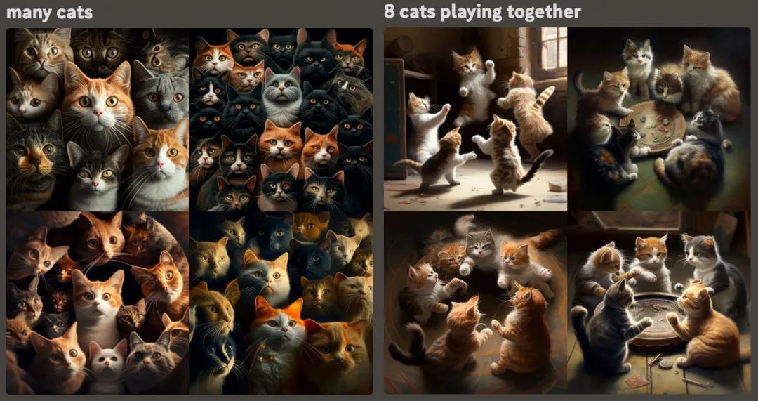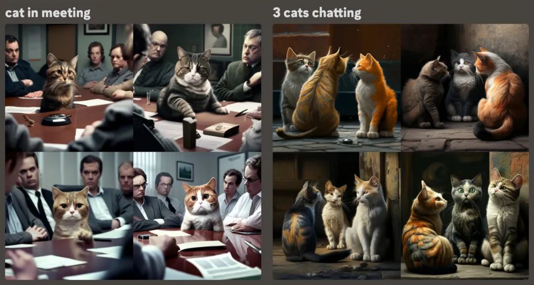 例如想生成貓咪開會的圖片,我們想要的場景肯定是一群在開會的貓,而不是人們在開會的時(shí)候會議室里有只貓,因此避免用「cat in meeting」,改用「3 cats chatting」。